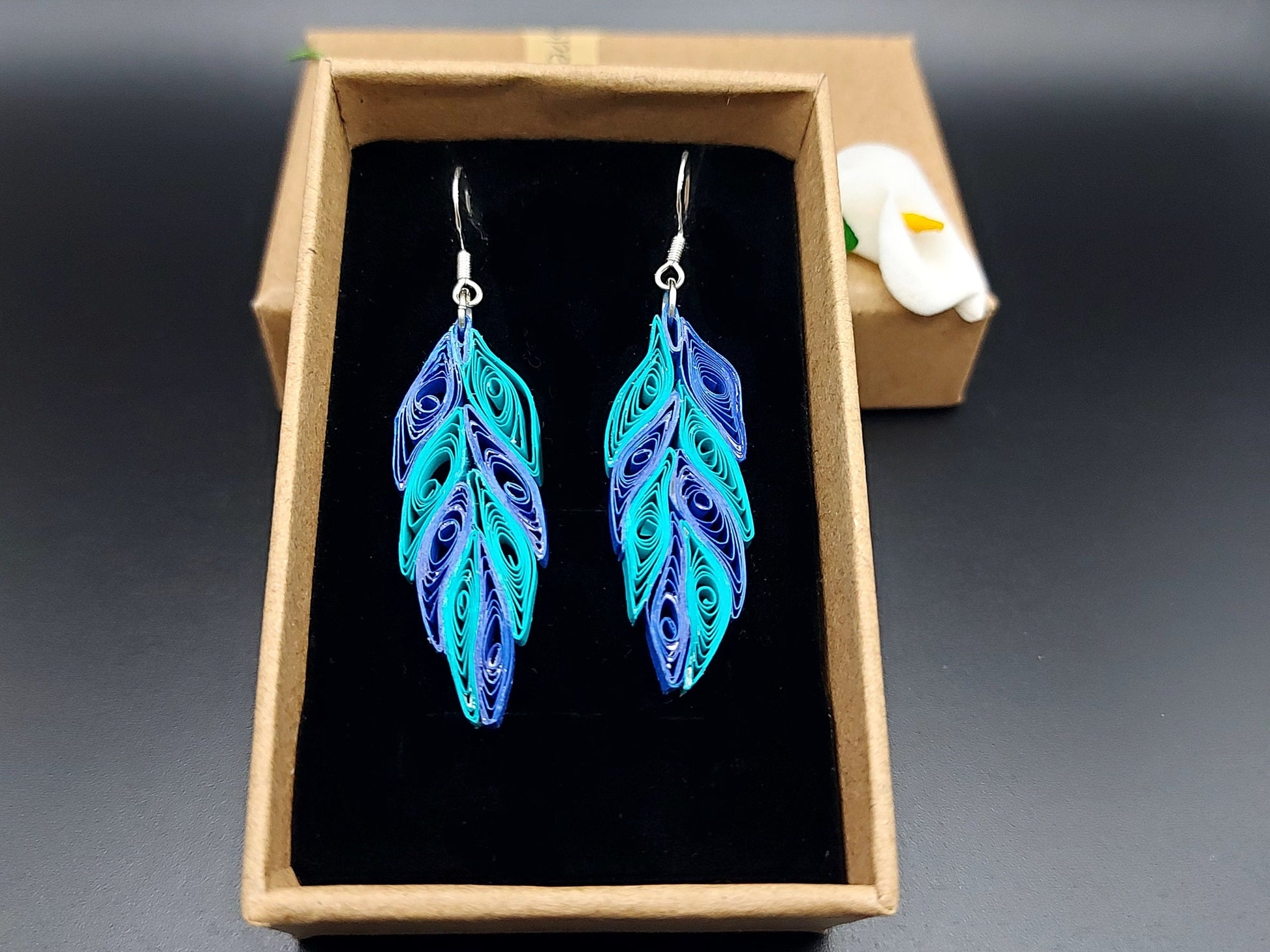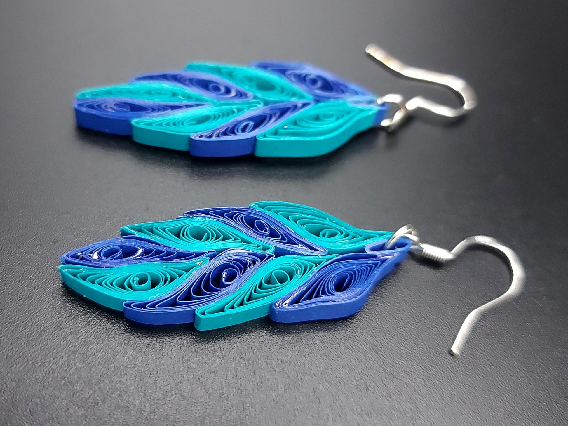 These hand crafted earrings are made from 1/8" thick quilling paper strips. They are attached to hypoallergenic silver plated earring hooks.