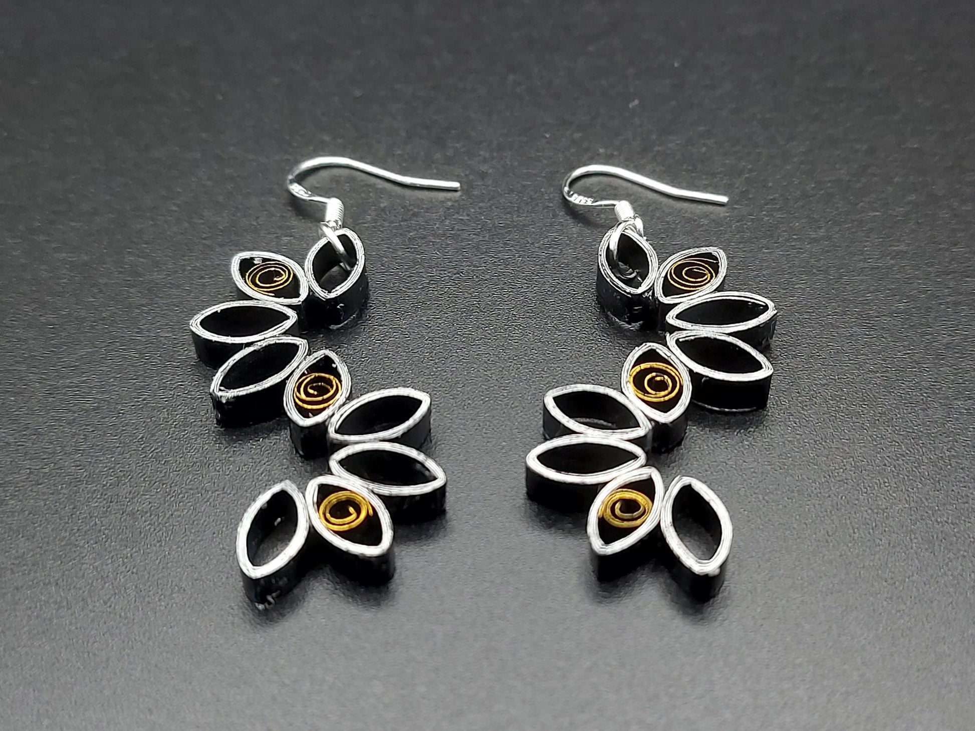 These hand crafted earrings are made from 1/8" thick quilling paper strips in silver edge black color. The sides and backside of the earrings are black. They are attached to hypoallergenic ball post earring studs.