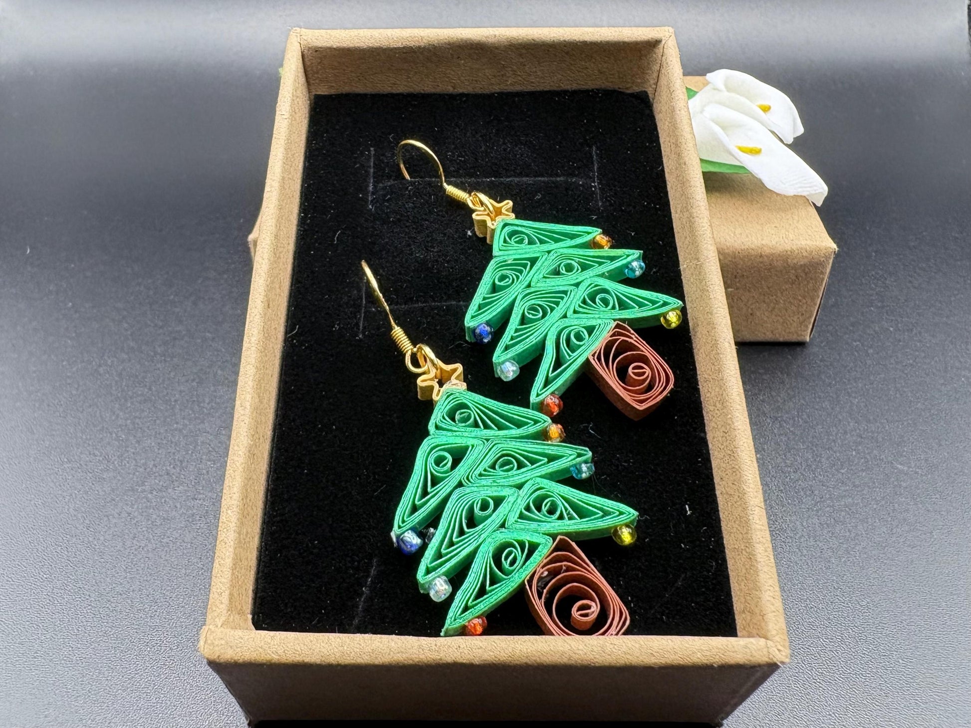 Are you looking for a special gift for someone or yourself? This is exactly what you are looking for. These beautiful hand crafted earrings are made from 1/8" thick quilling paper strips in green gilded edge, brown and gold colors. They are attached to hypo-allergenic silver plated earring hooks.