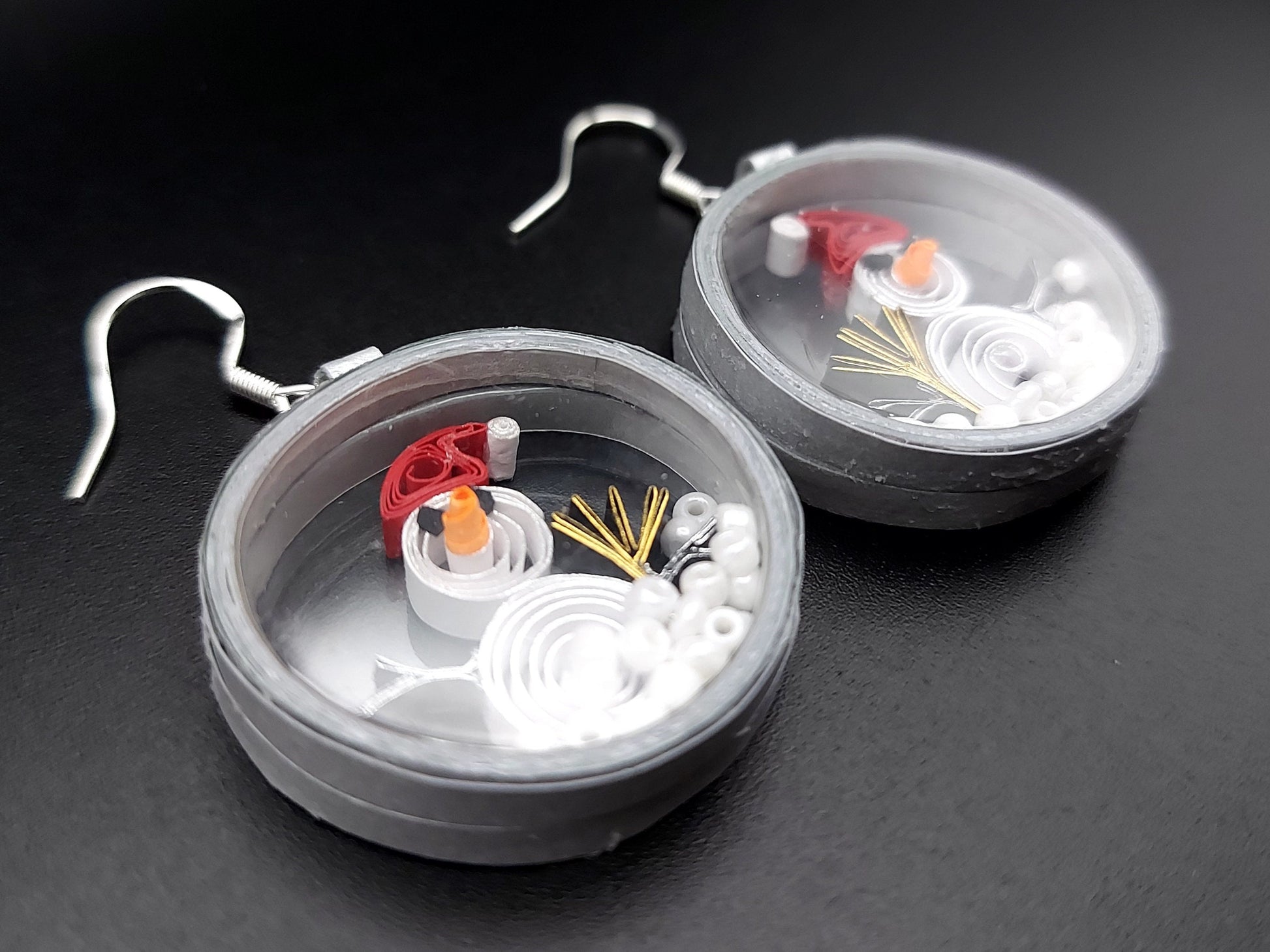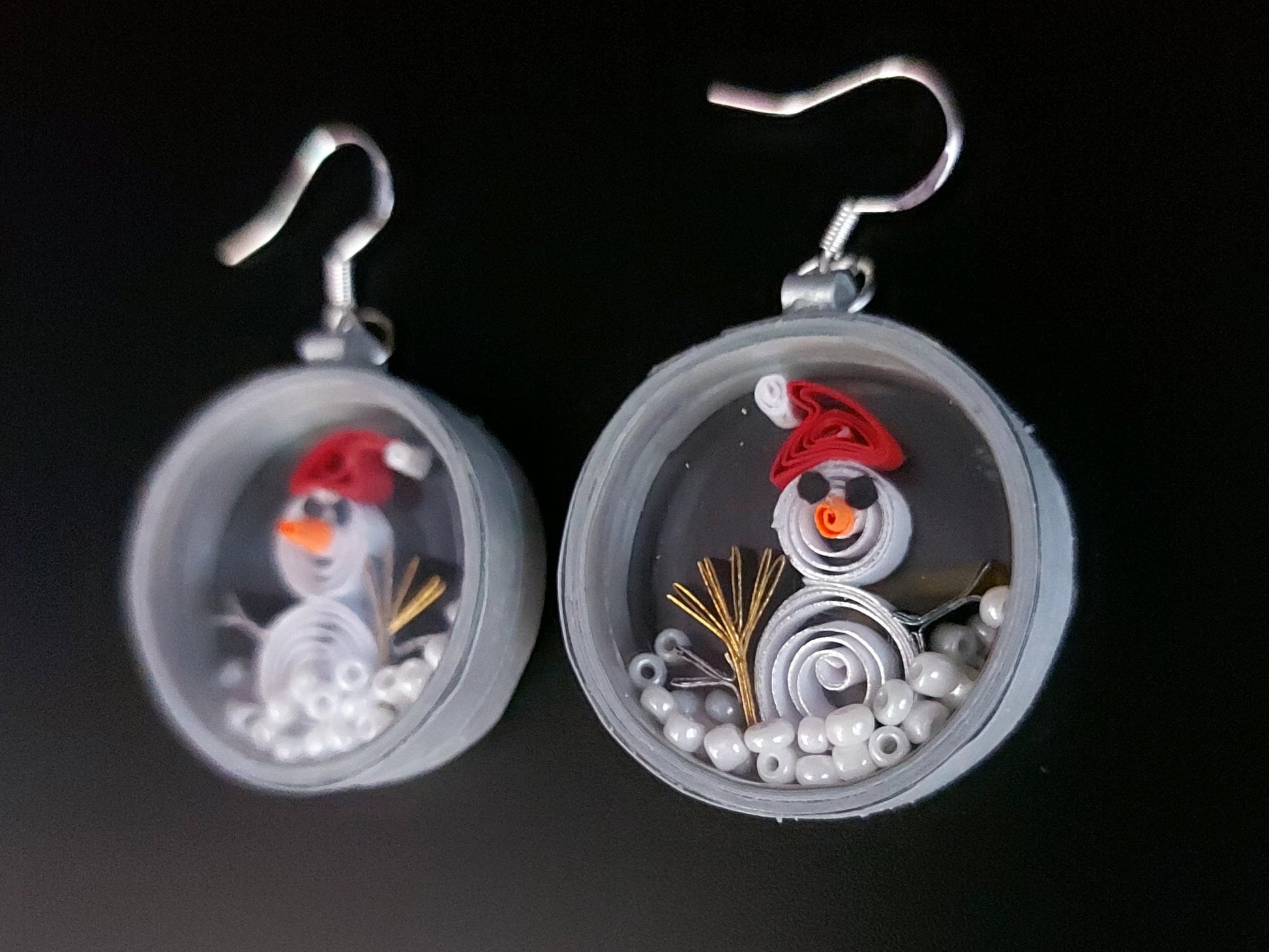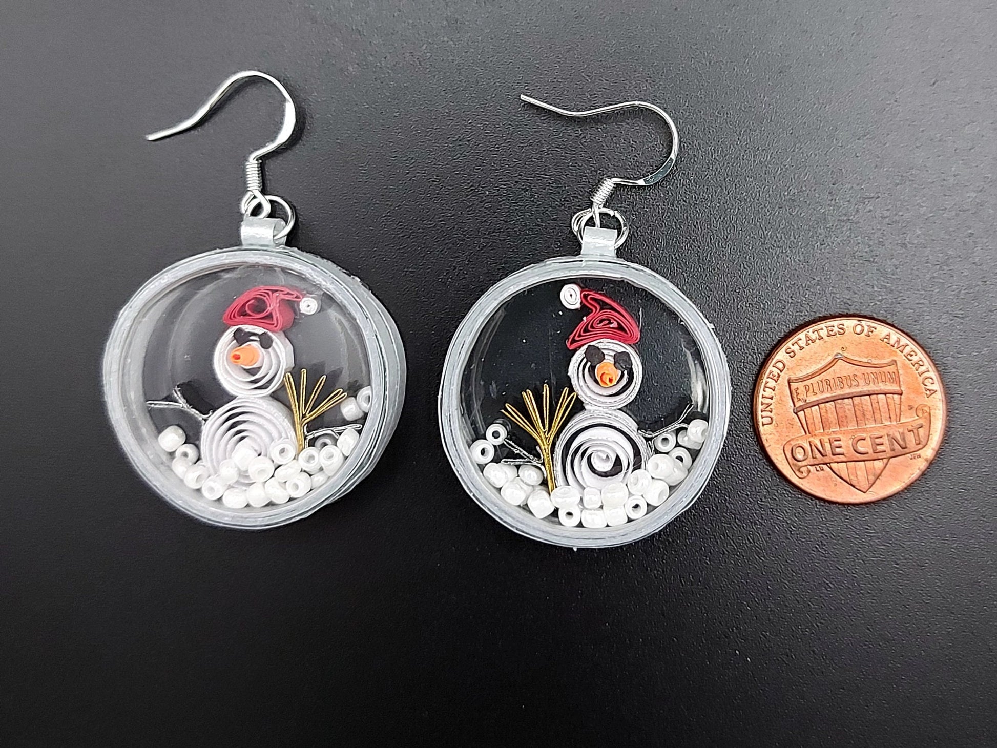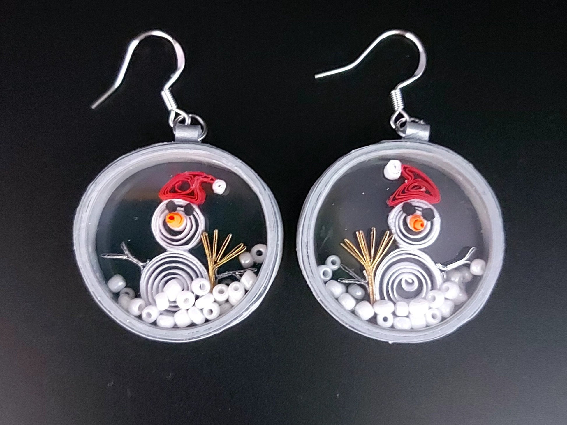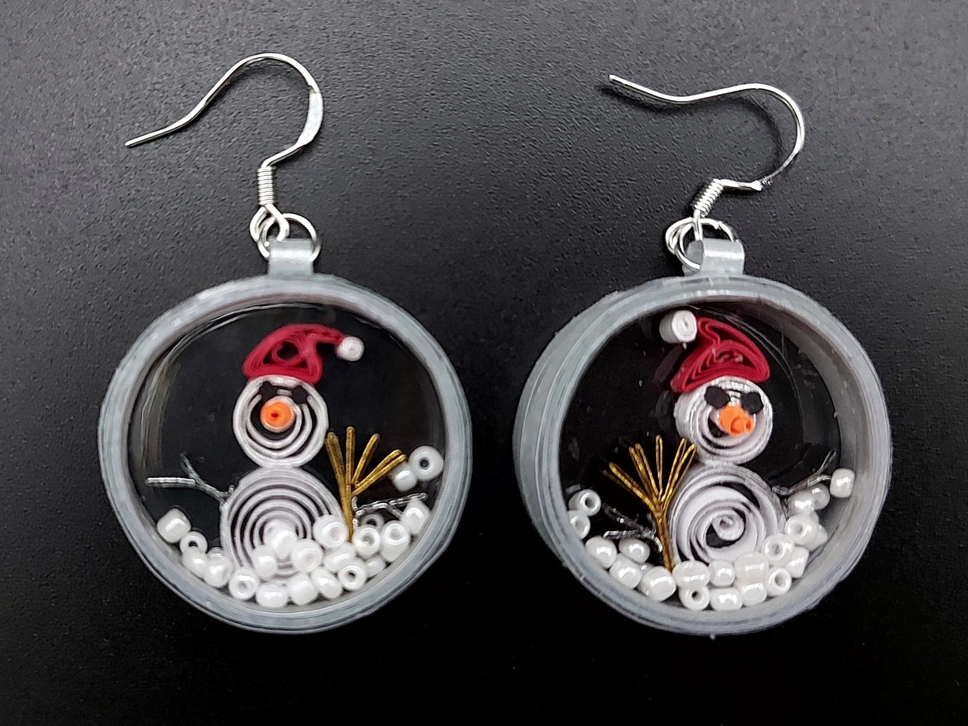 Are you looking for a special gift for someone or yourself? This is exactly what you are looking for. This beautiful hand crafted earring is made from 1/8" thick quilling paper strips in metallic silver, gold edged black and ivory colors. Silver glitter and white beads are contained in a plastic screen chamber, and they are movable as well as the snowman itself. The earring is attached to a hypo-allergenic silver plated earring hook.