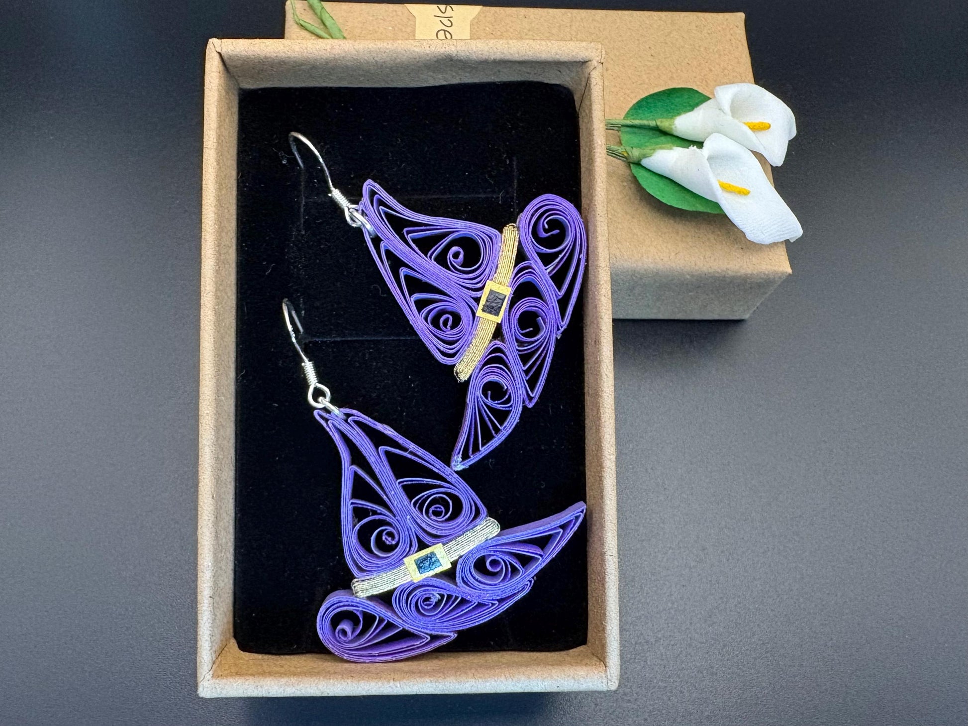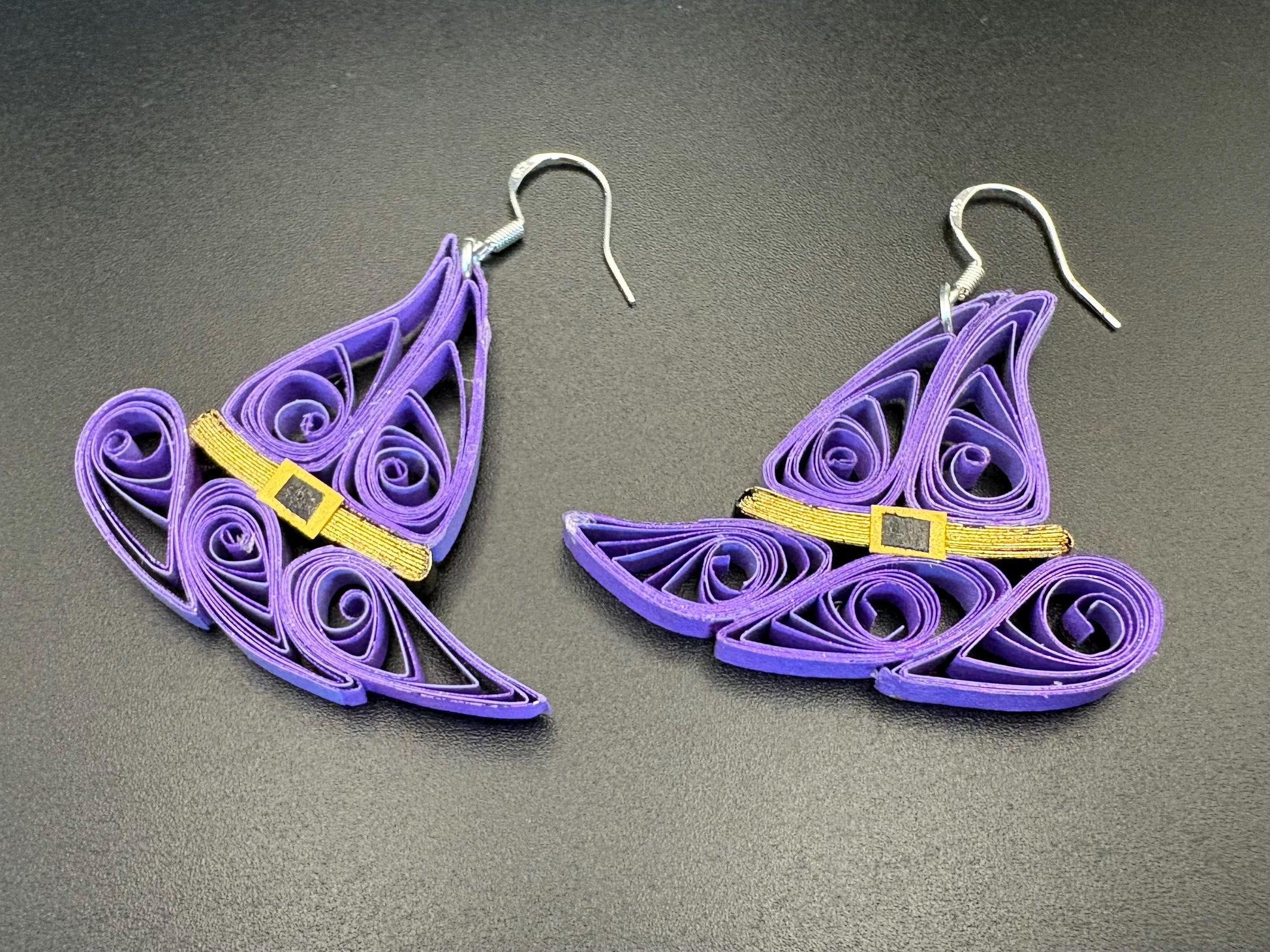 Are you looking for Halloween earrings? This is exactly what you are looking for. These hand crafted earrings are made from 1/8" thick quilling paper strips. They are attached to hypoallergenic silver plated earring hooks.