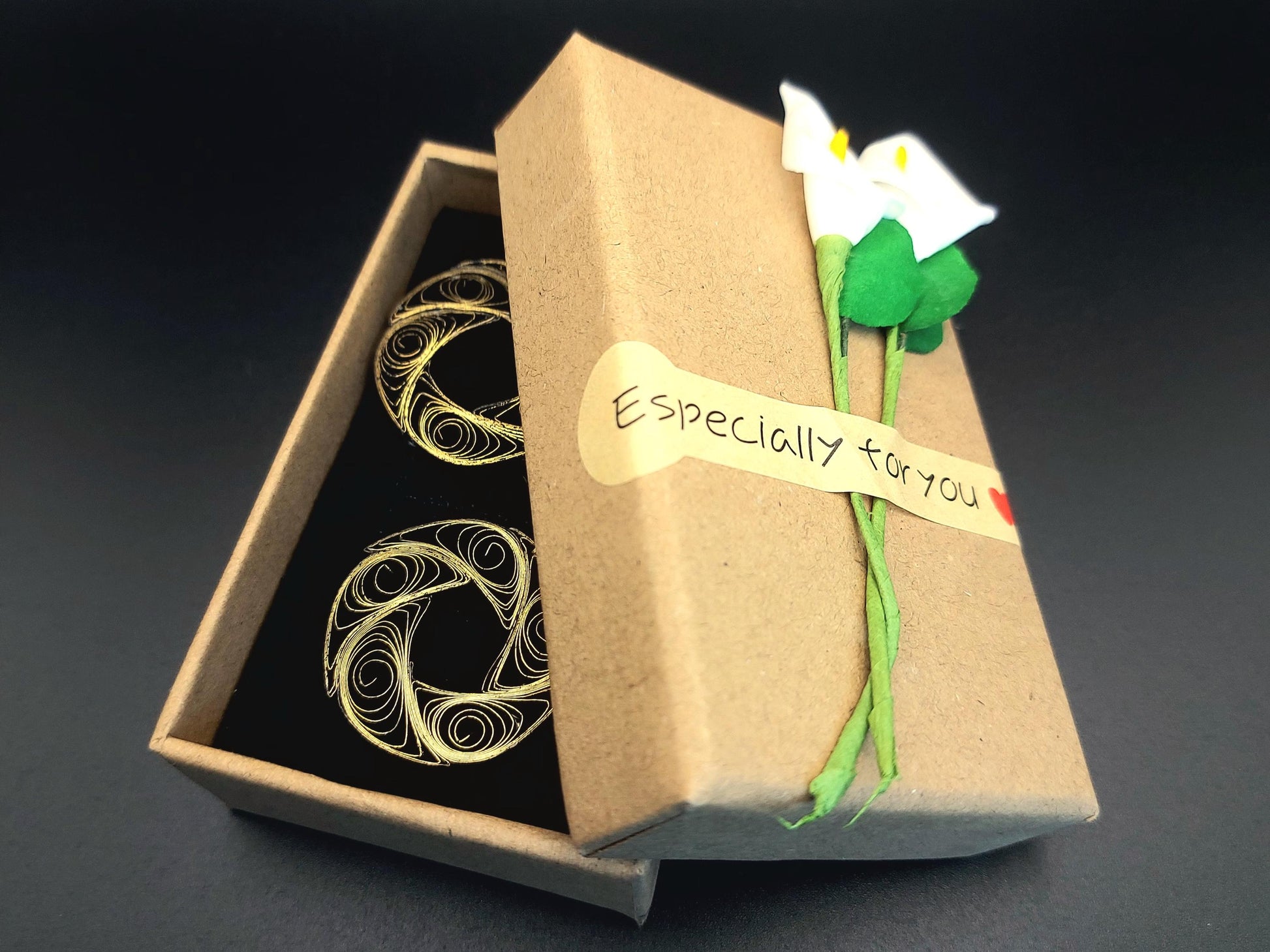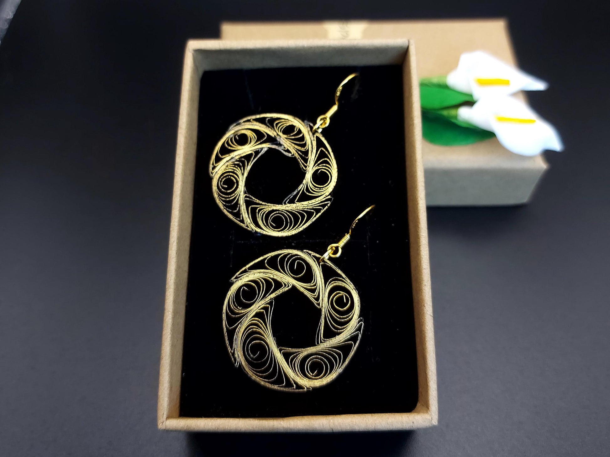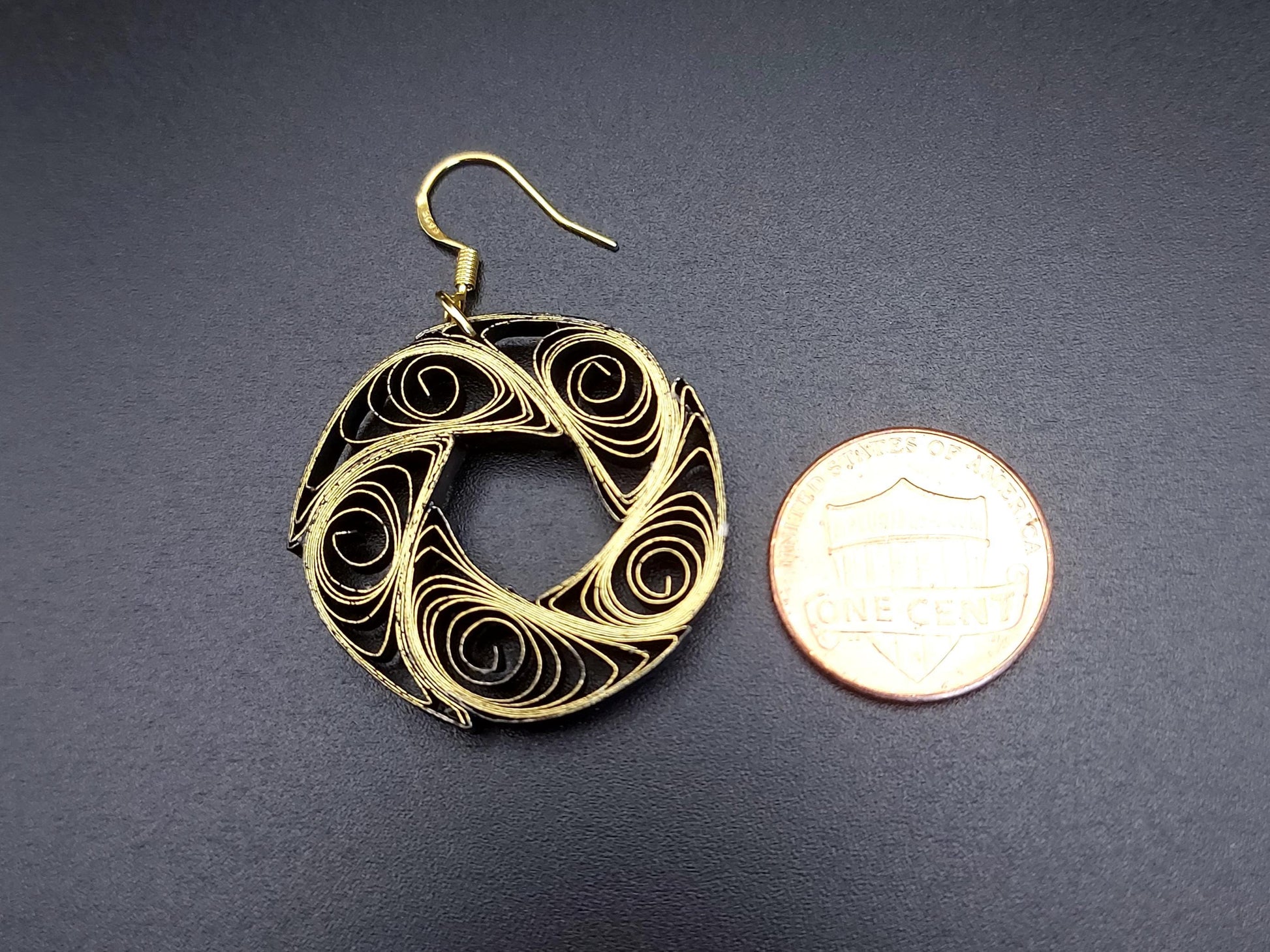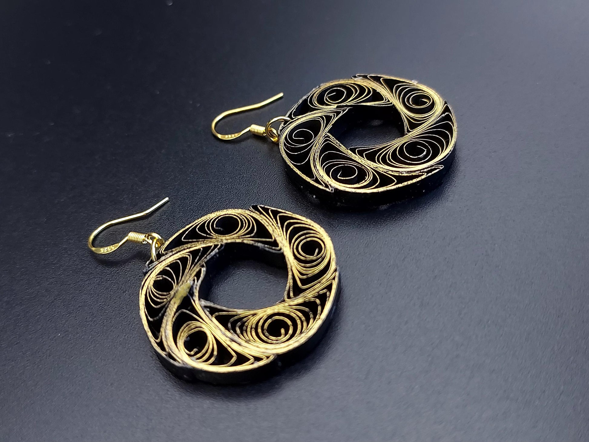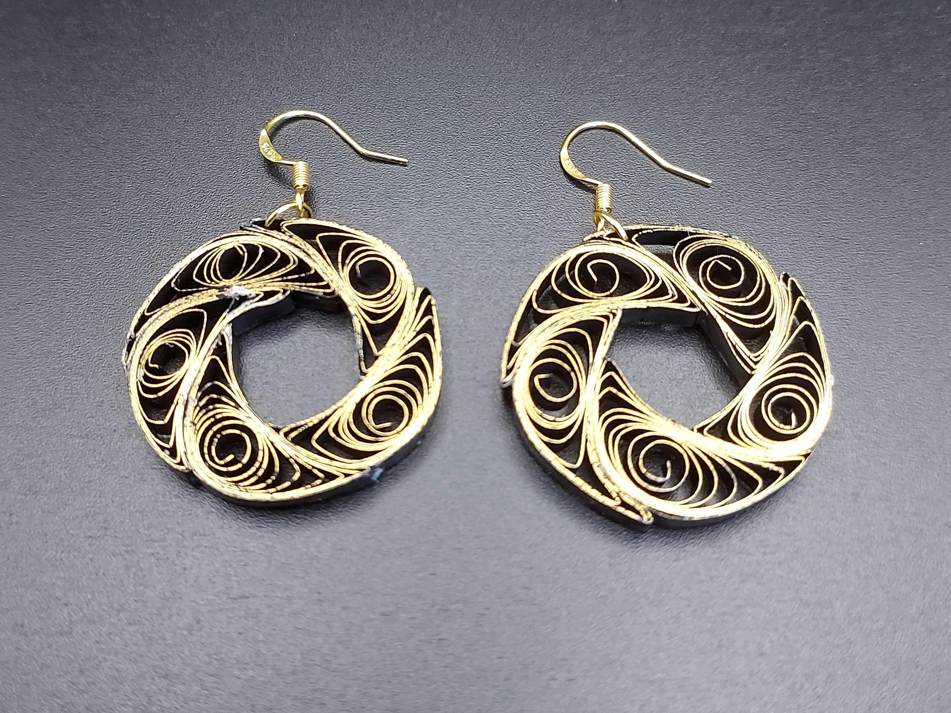 Are you looking for a special gift for someone or yourself? This is exactly what you are looking for. These beatiful hand crafted earrings are made from 1/8" thick quilling paper strips in gold gilded edge on black color. The sides and backside of the earrings are black. They are attached to Hypoallergenic Silver Plated Earring Hooks.