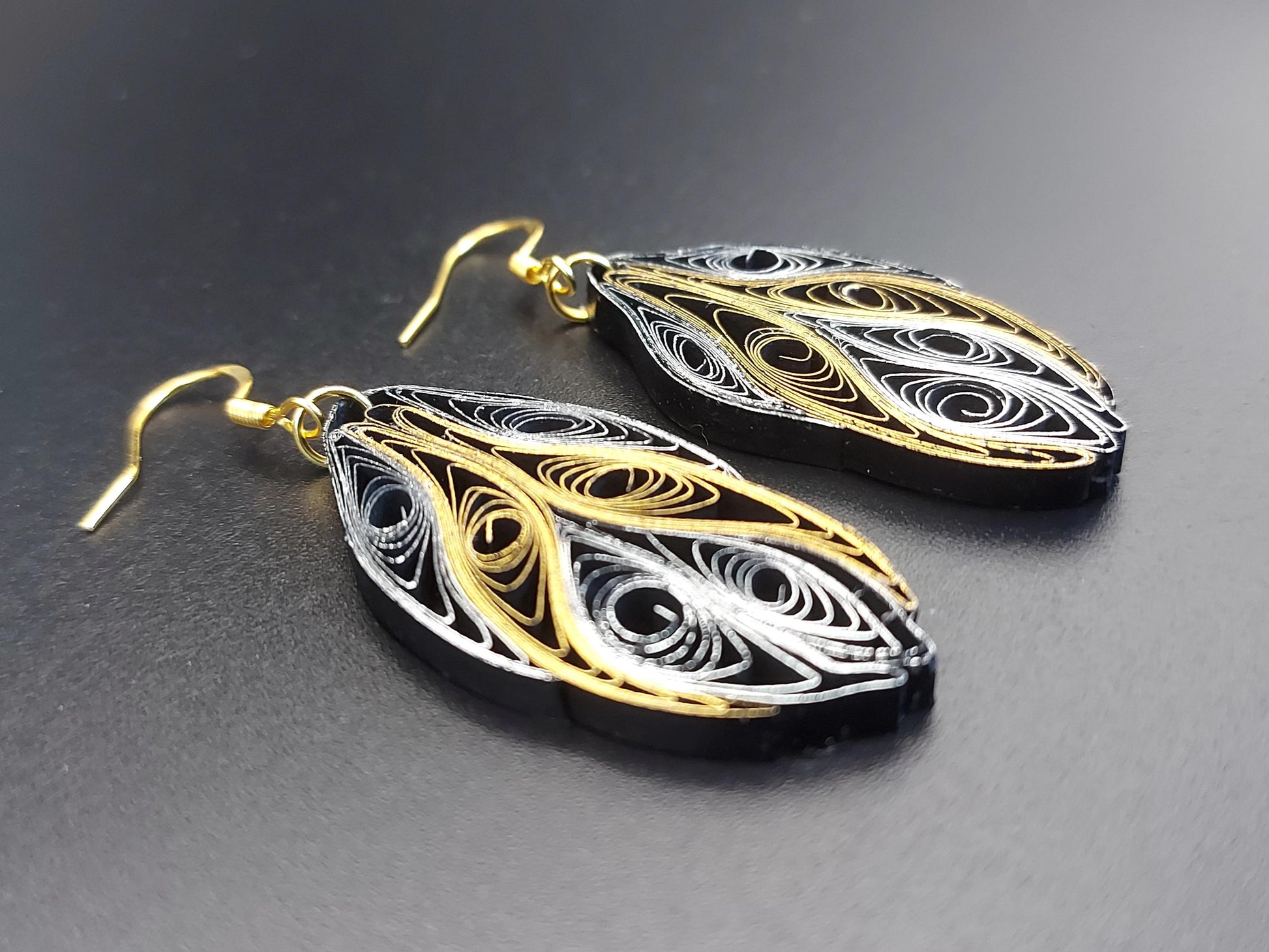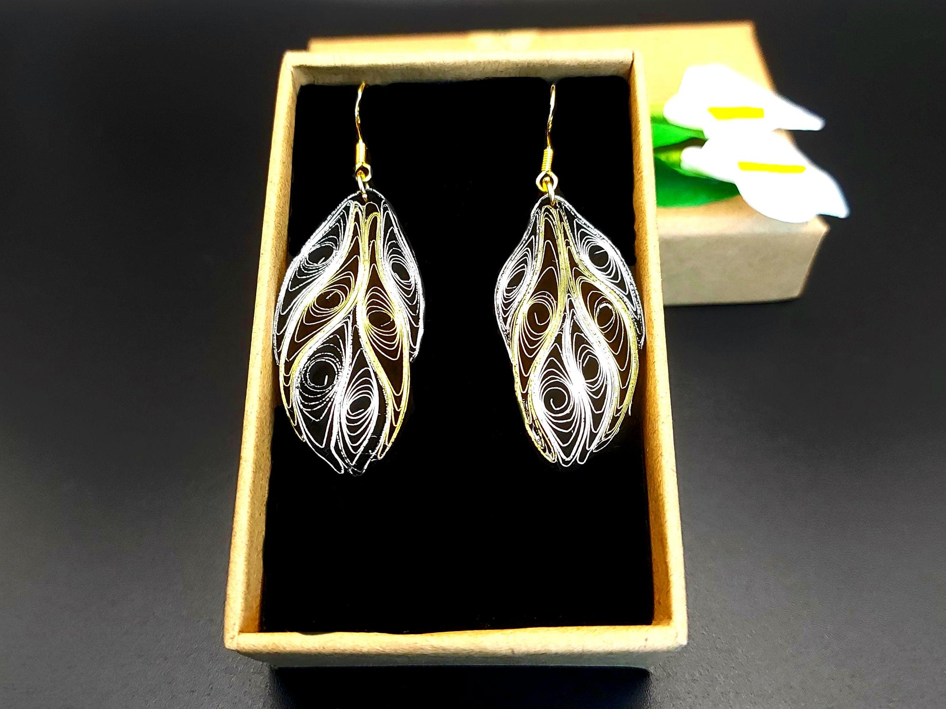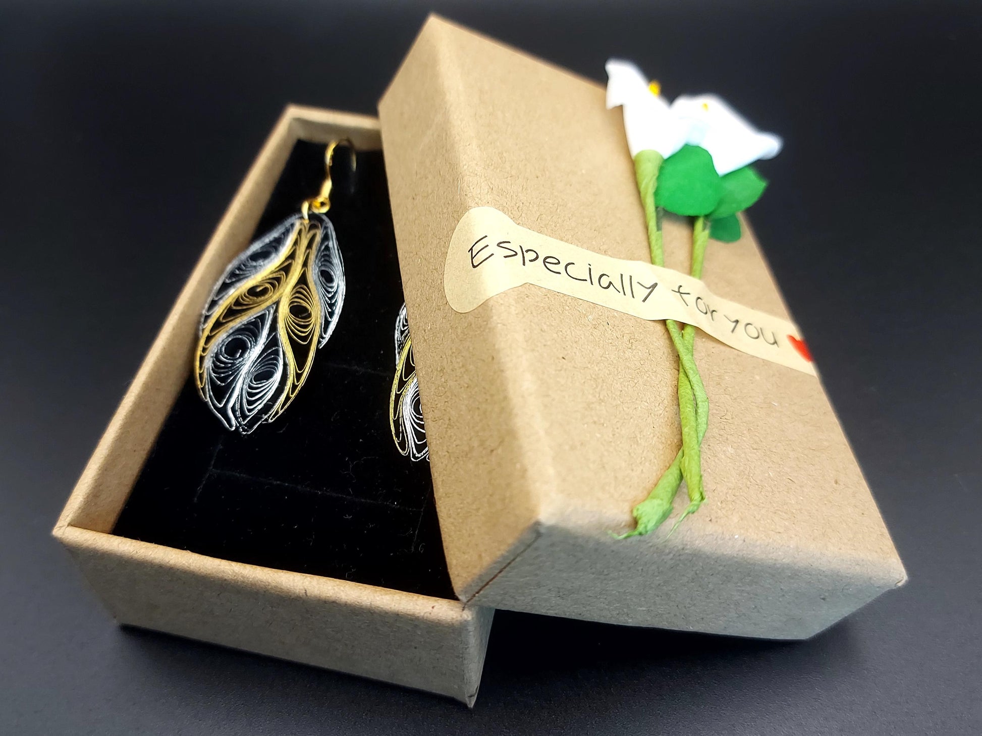 Are you looking for a special gift? This is exactly what you are looking for. These hand crafted earrings are made from 1/8" thick quilling paper strips. They are attached to hypoallergenic silver plated earring hooks.