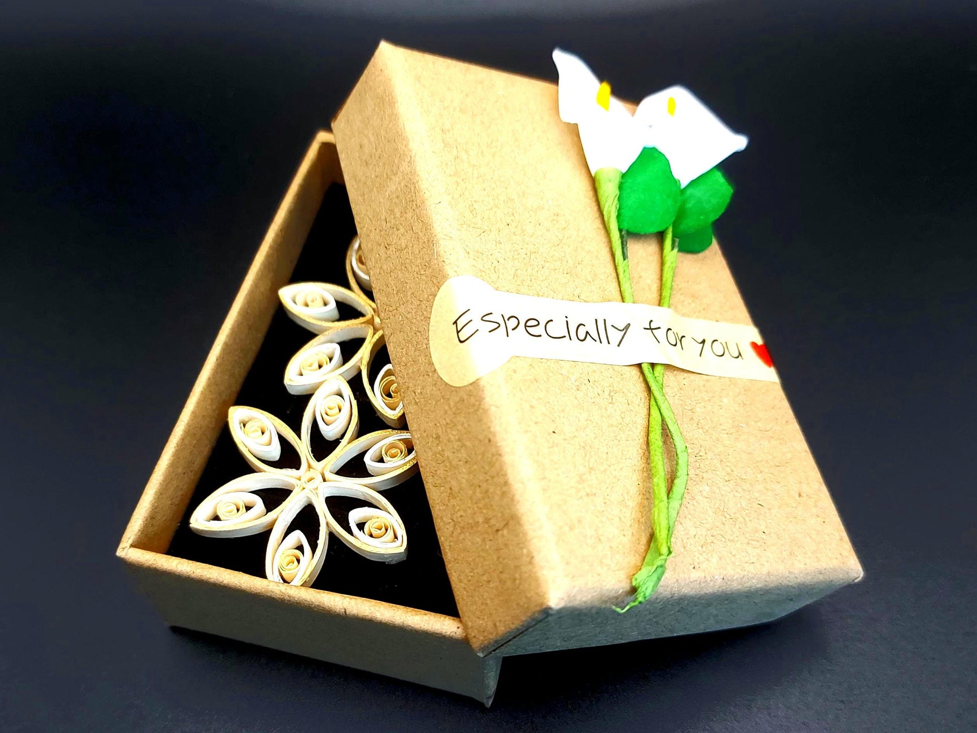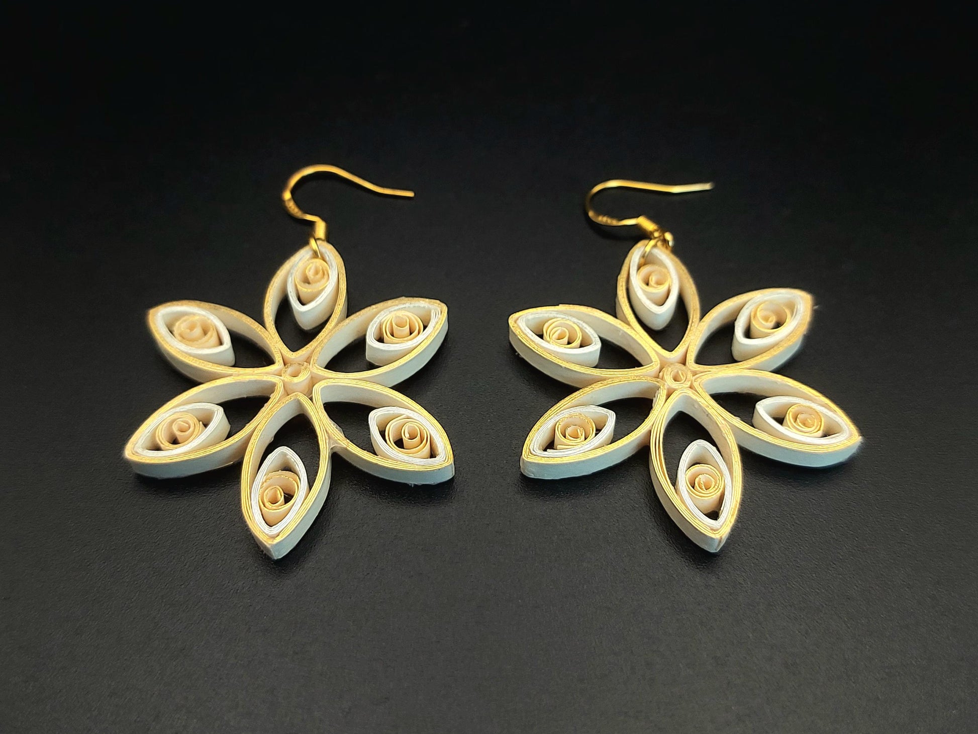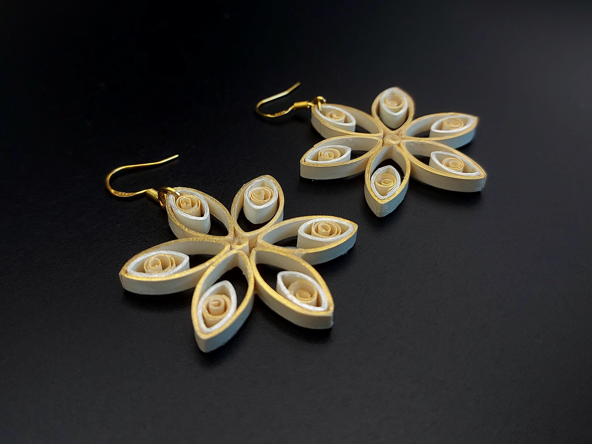 Are you looking for a special gift for someone or yourself? This is exactly what you are looking for. These beatiful hand crafted earrings are made from 1/8" thick quilling paper strips in gold gilded edge on ivory color. They are attached to Hypoallergenic Silver Plated Earring Hooks.