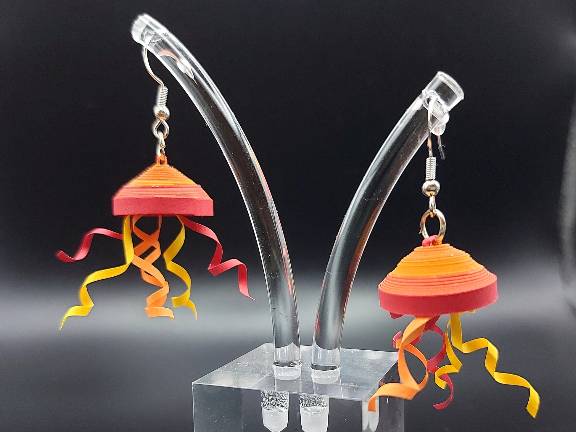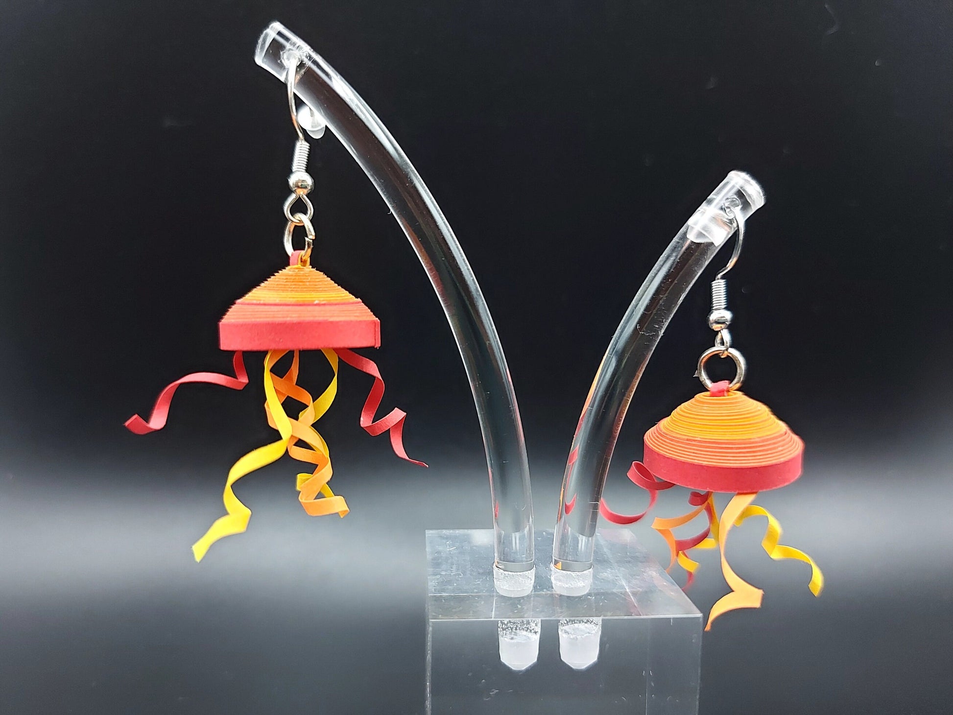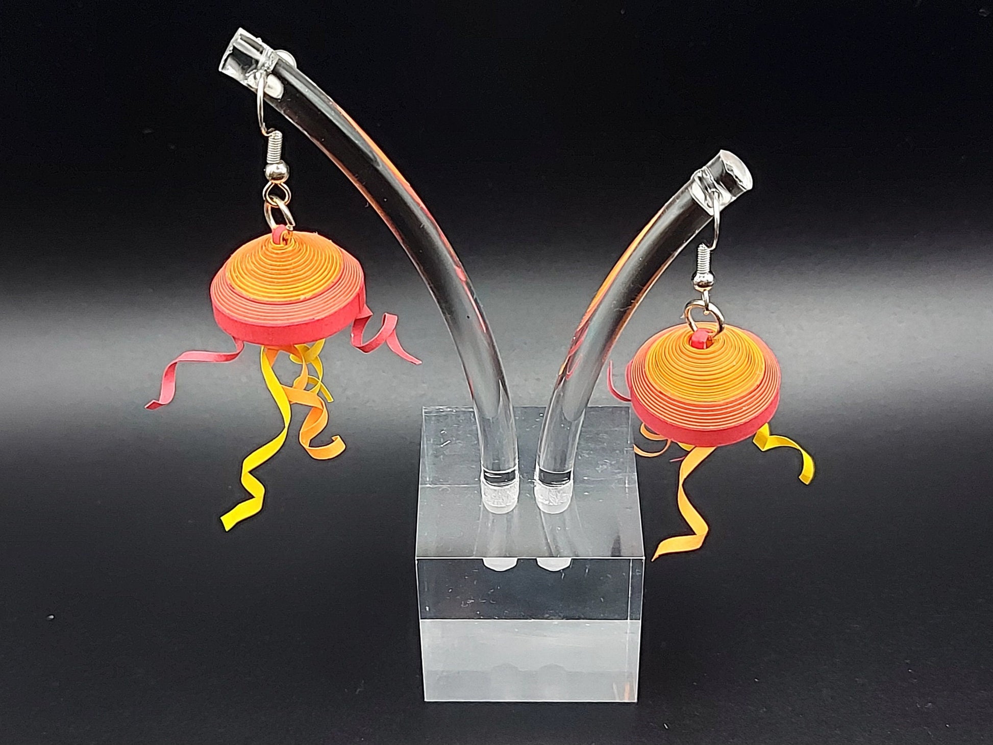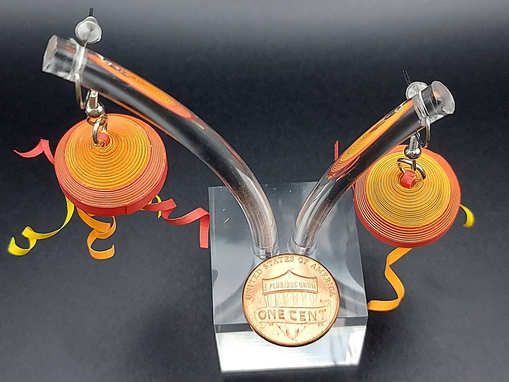 Are you looking for a special gift for someone or yourself? This is exactly what you are looking for. These beautiful hand crafted earrings are made from 1/8" thick quilling paper strips in orange, yellow and red colors. They are attached to hypo-allergenic silver plated earring hooks.
