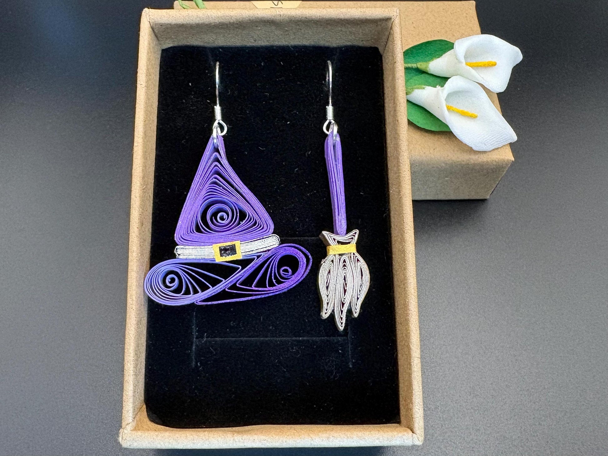 Are you looking for Halloween earrings? This is exactly what you are looking for. These hand crafted earrings are made from 1/8" thick quilling paper strips. They are attached to hypoallergenic silver plated earring hooks.