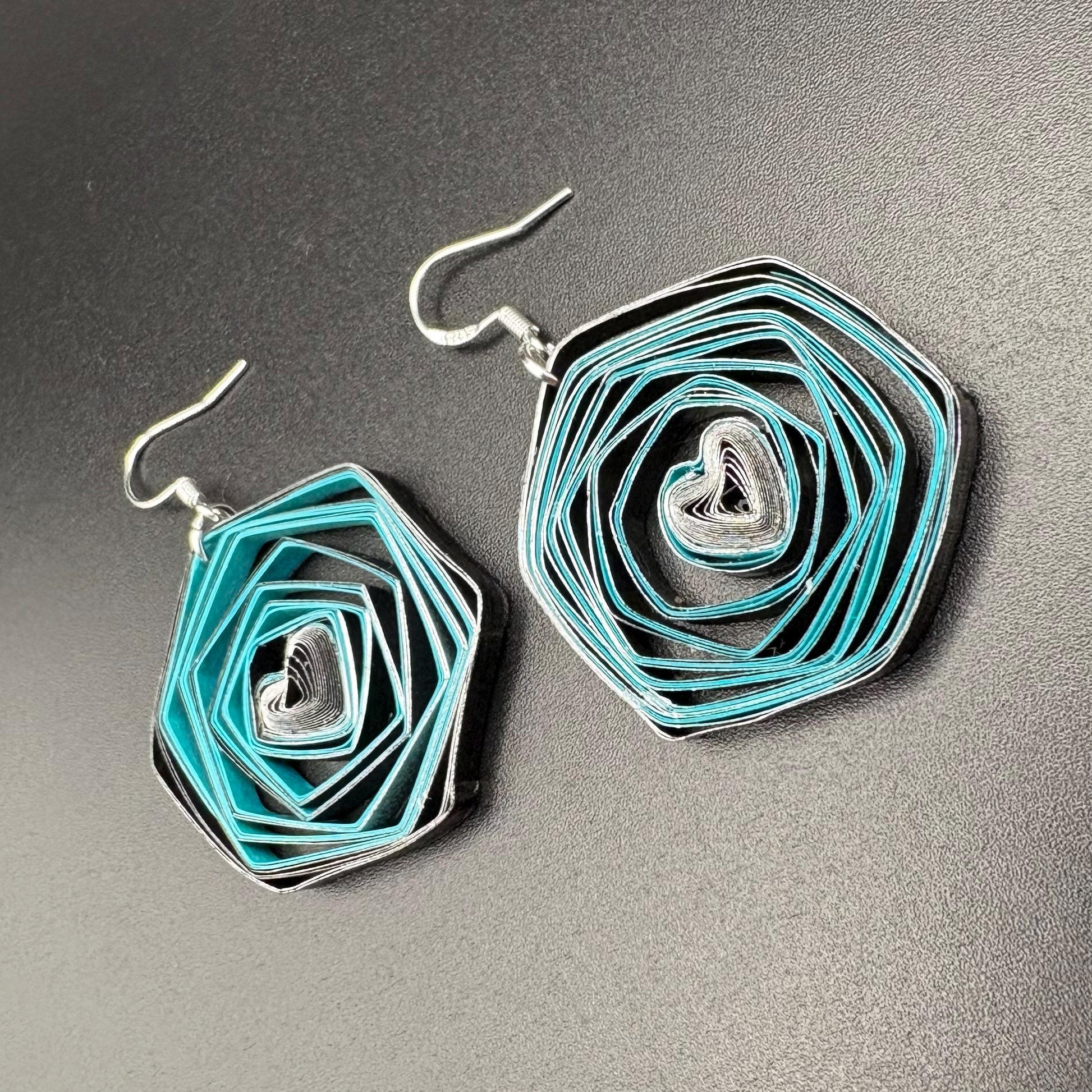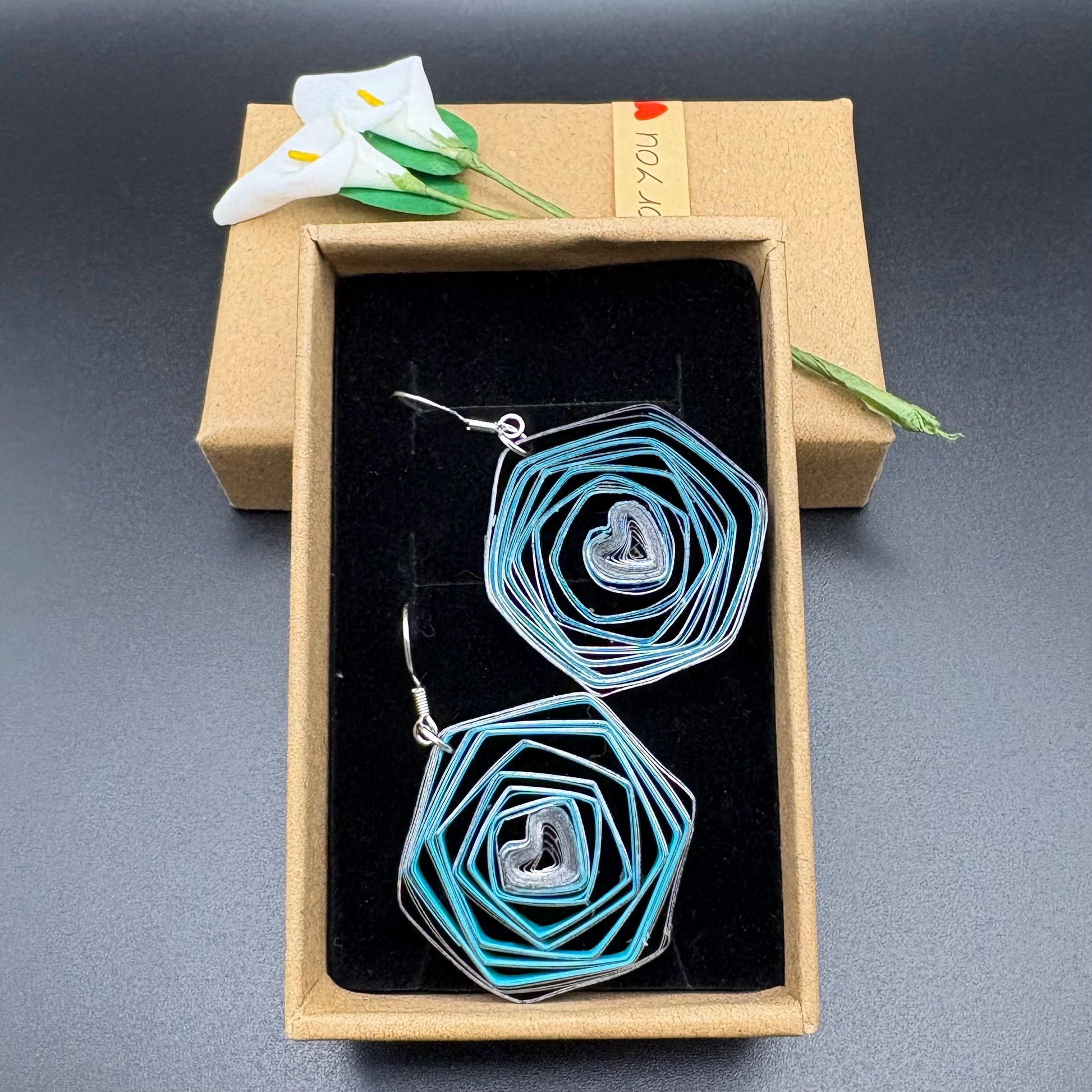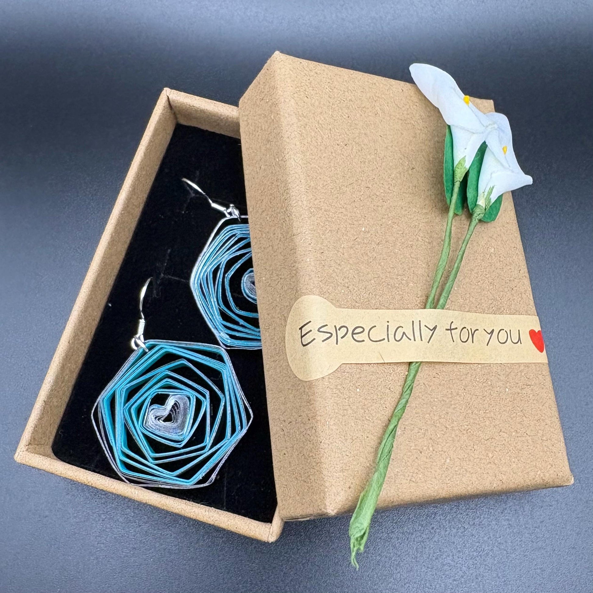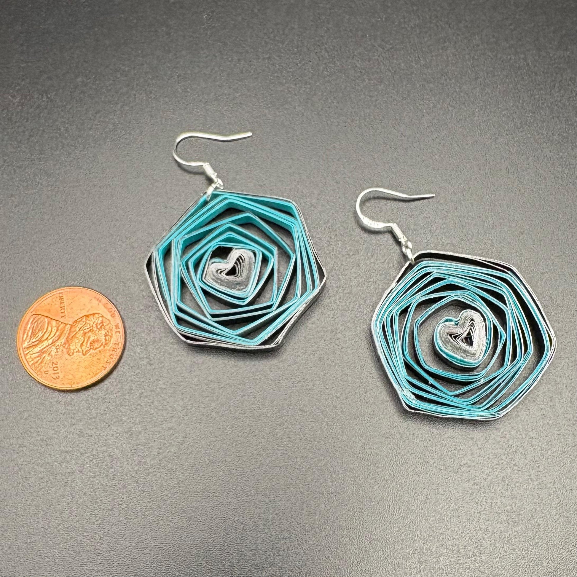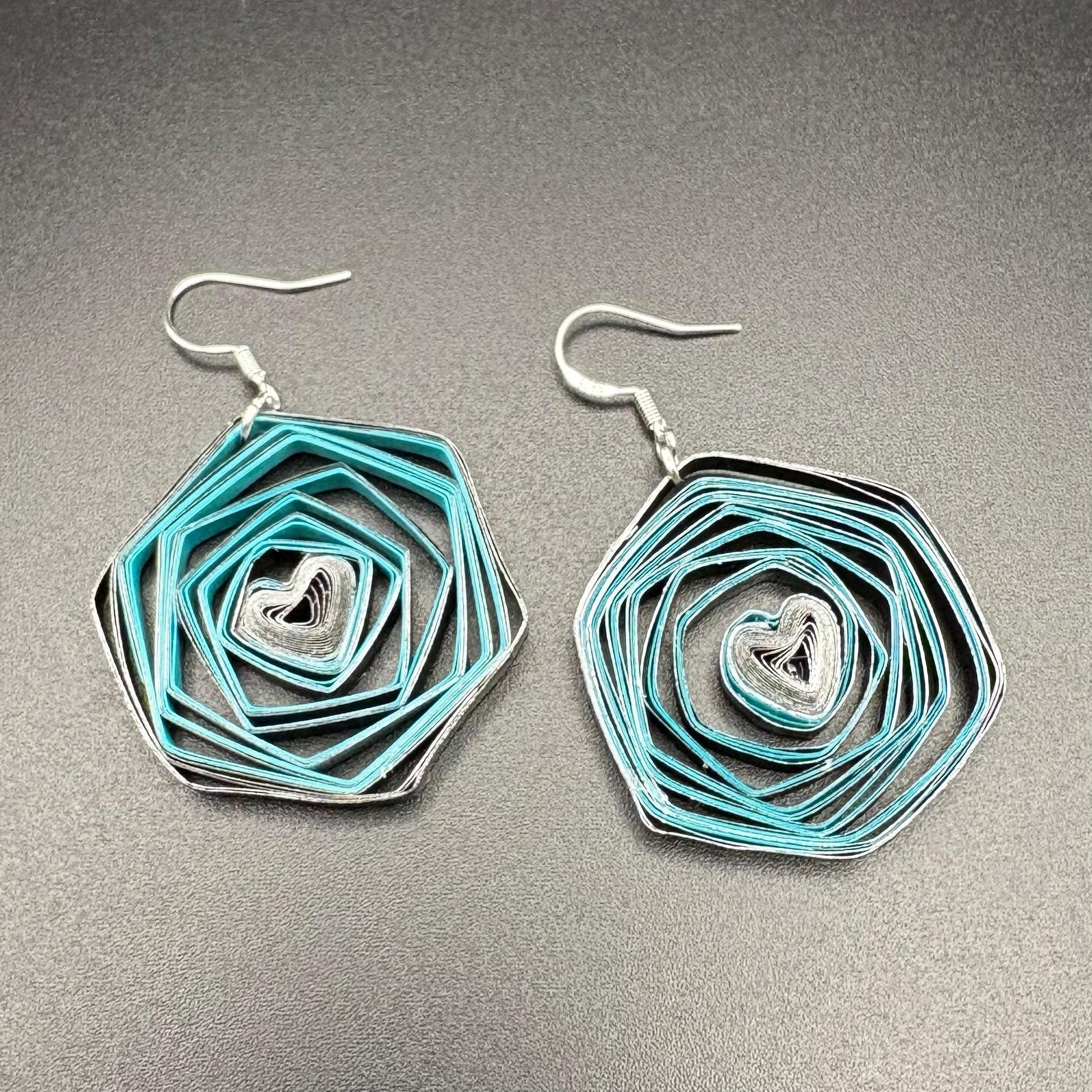 Are you looking for a special gift? This is exactly what you are looking for. These hand crafted earrings are made from 1/8" thick quilling paper strips. They are attached to hypoallergenic silver plated earring hooks.
