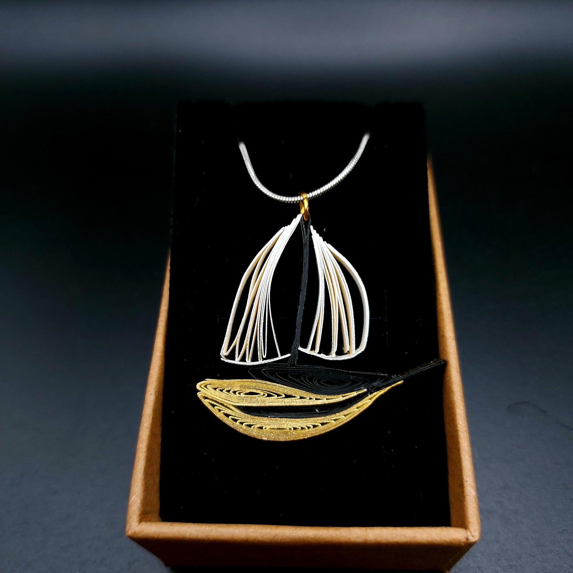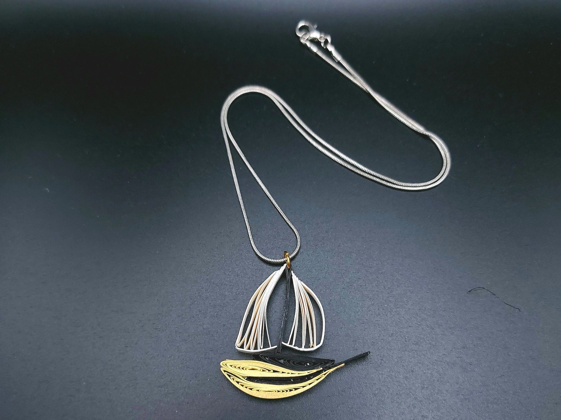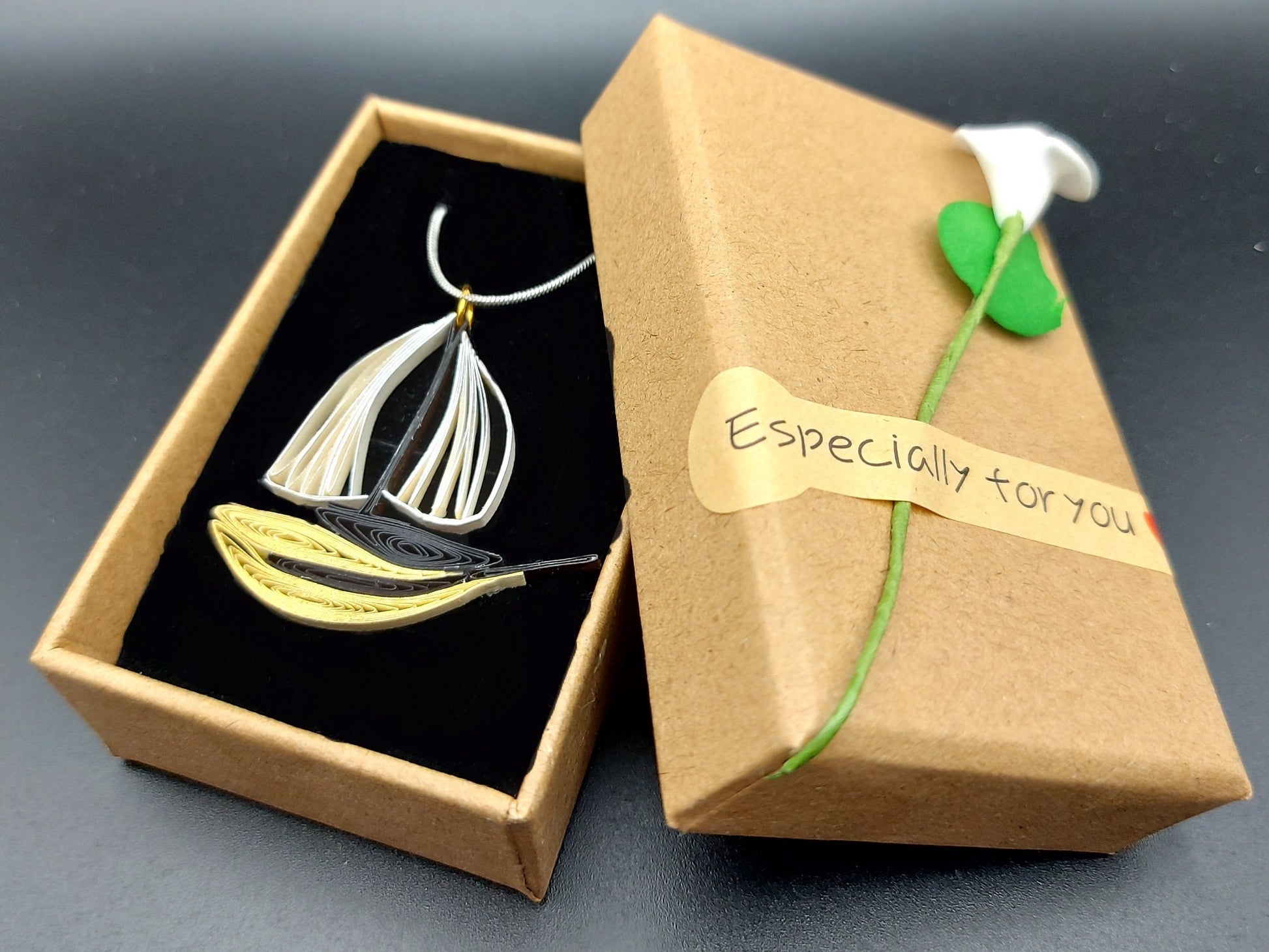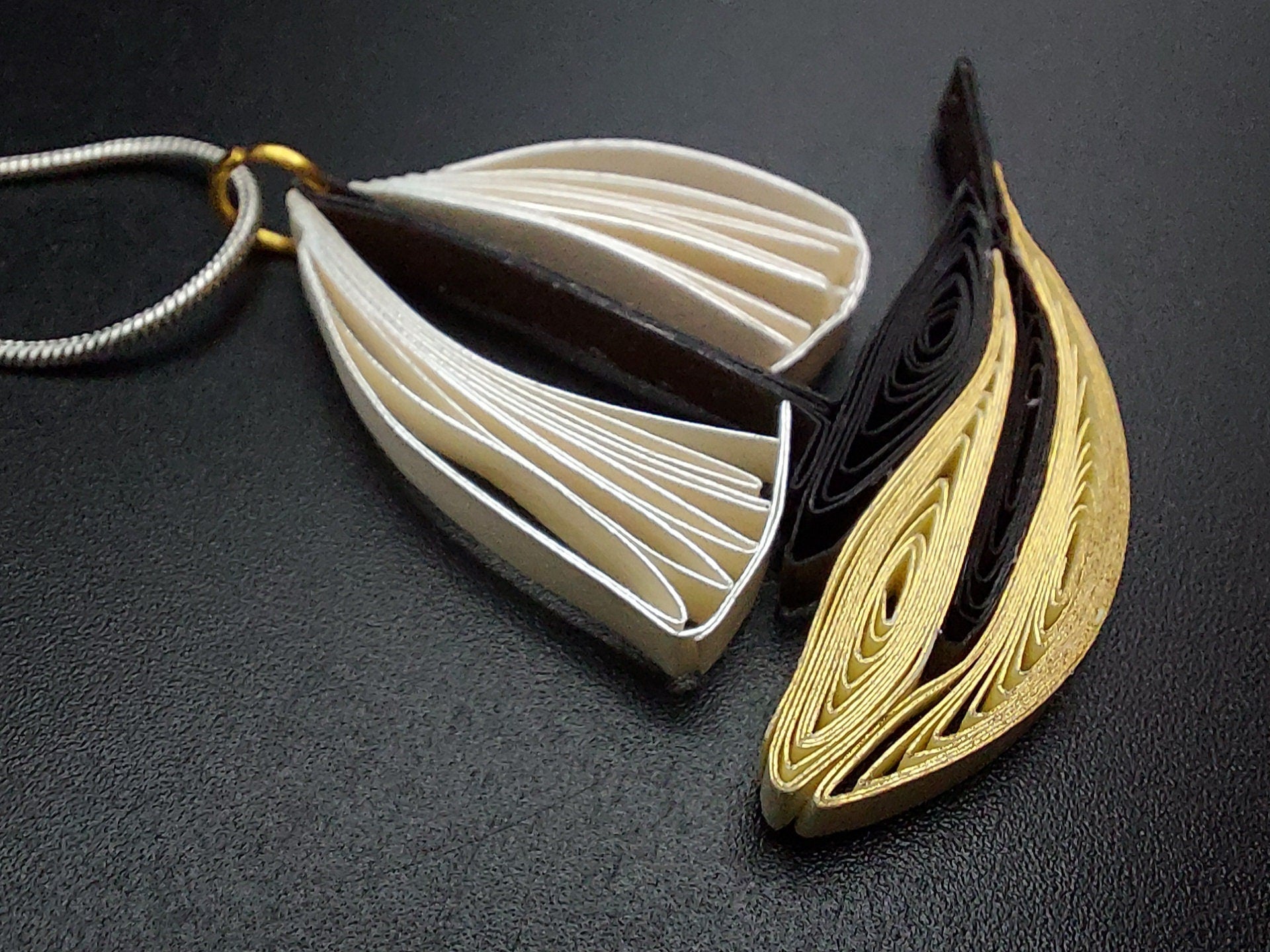 This beatiful hand crafted neclace charm is made from 1/8" thick quilling paper strips made of brown, silver and gold edged ivory colors.