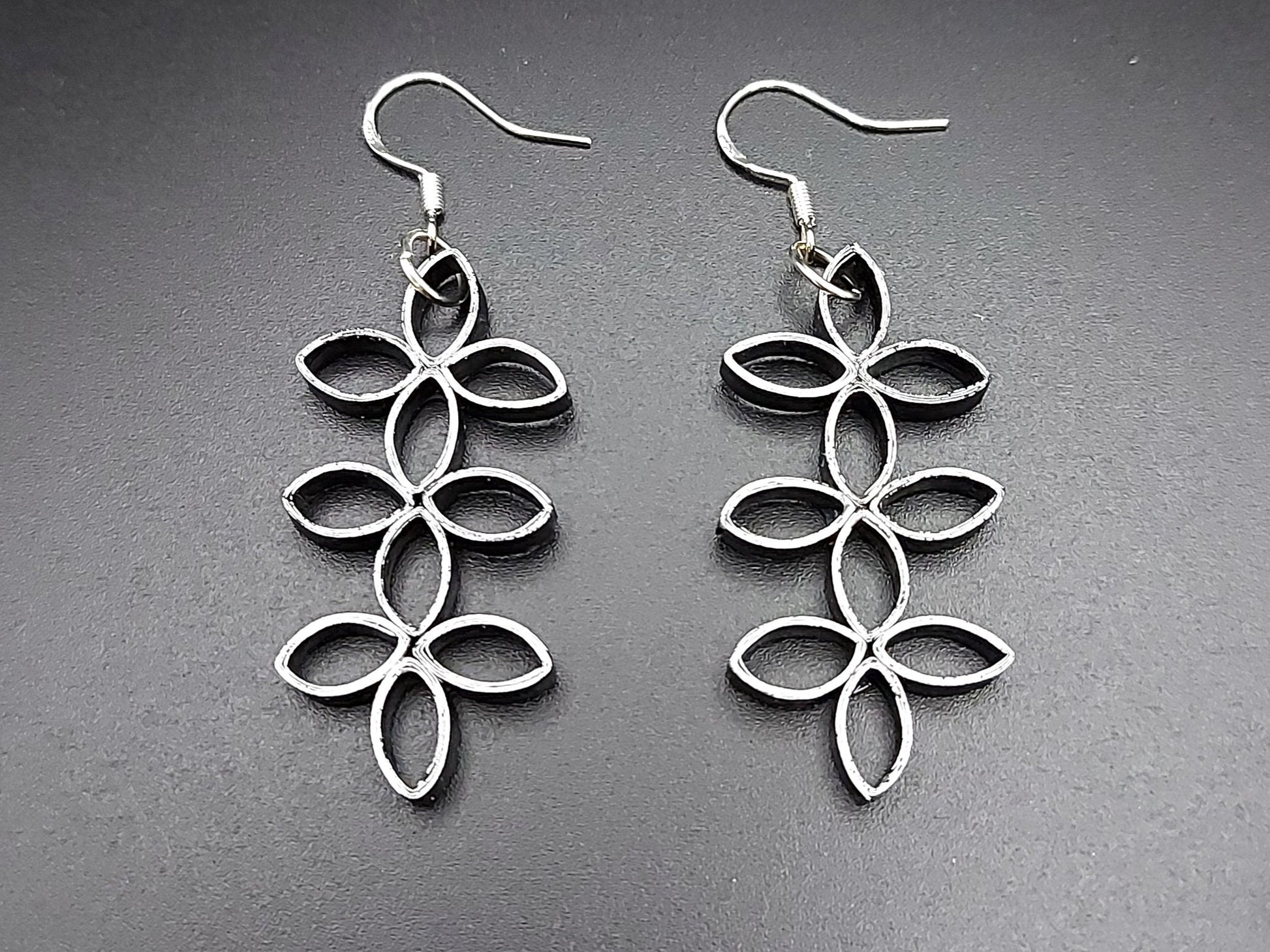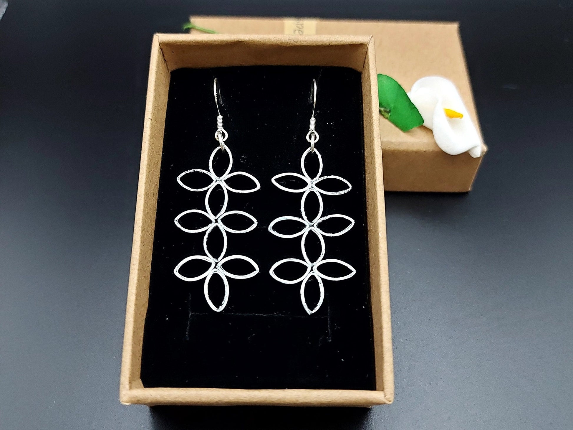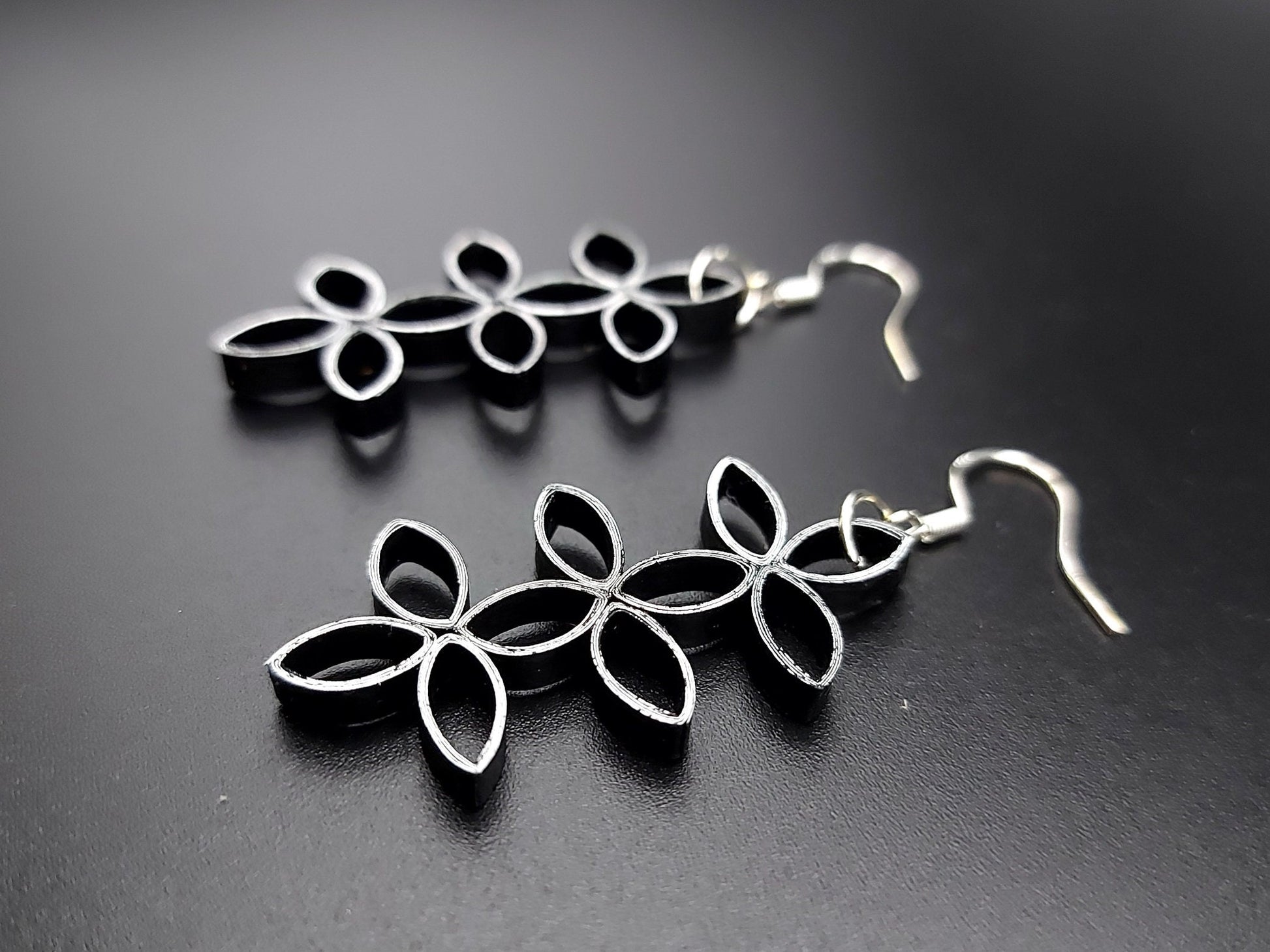 These beautiful hand crafted earrings are made from 1/8" thick quilling paper strips. Two variations are available: gold and gold edged black colors or gold and purple colors. They are attached to hypo-allergenic silver plated earring hooks.