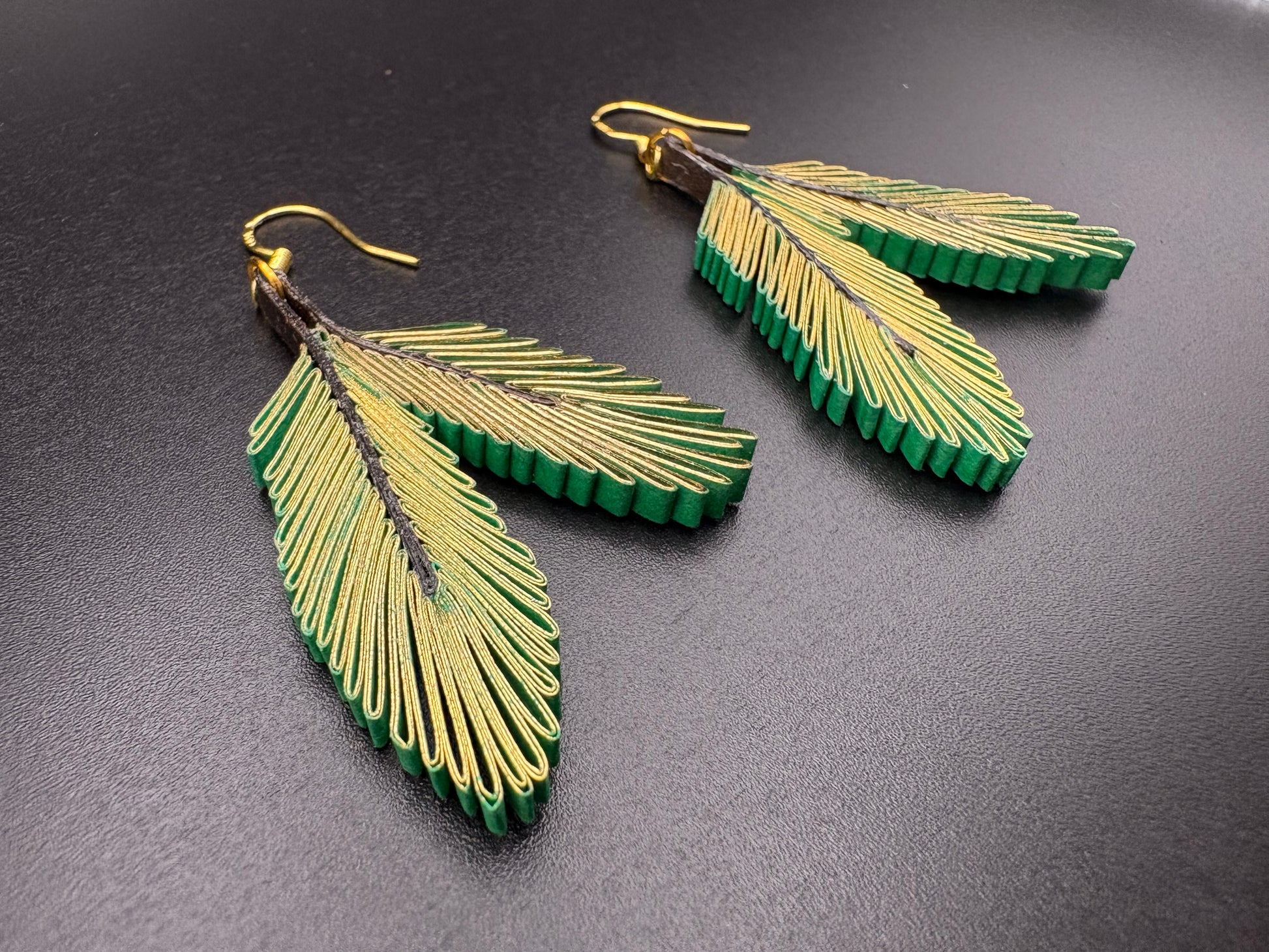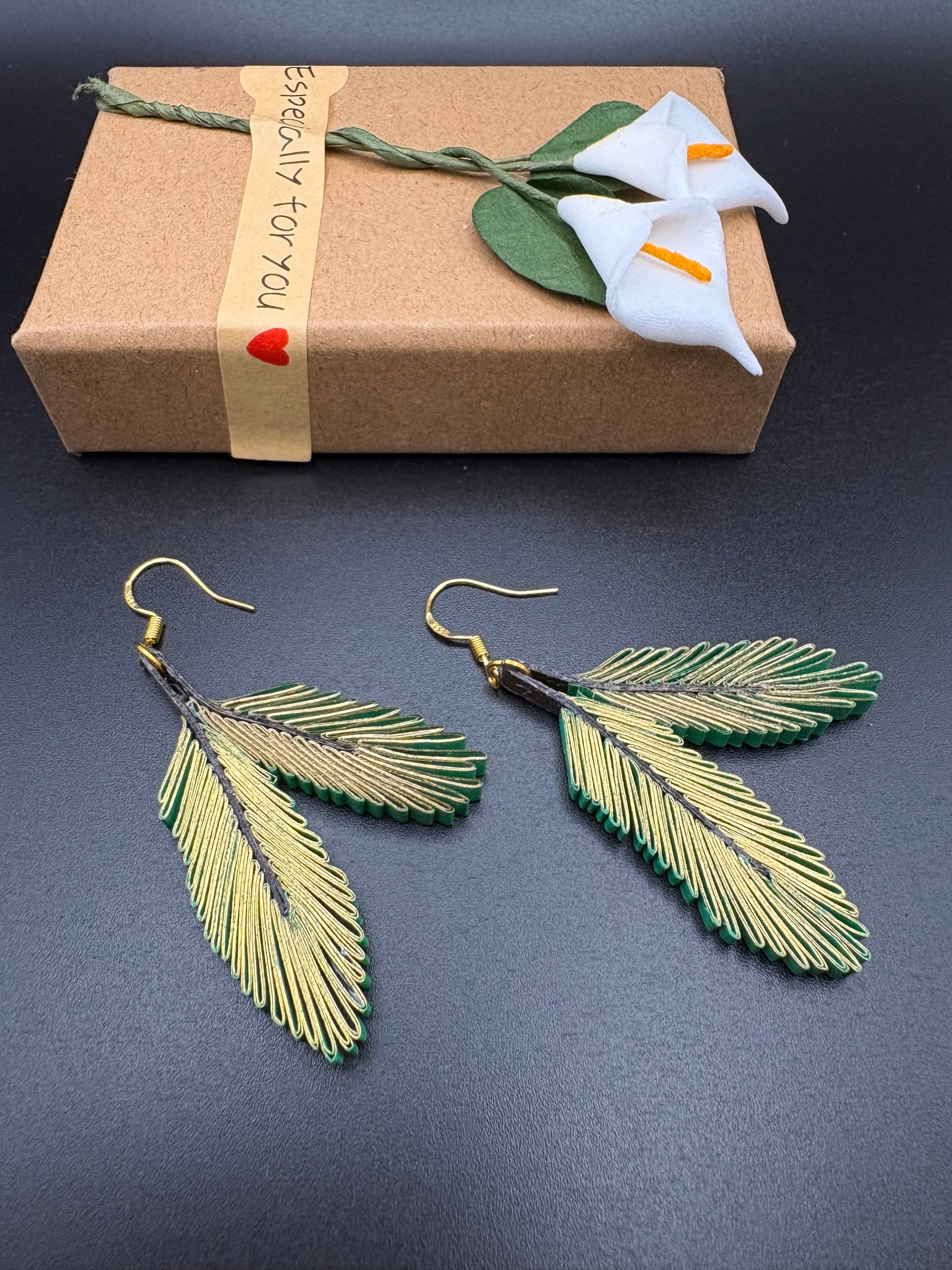 Carefully handcrafted using 1/8" wide quilling paper strips in gold gilded green. Each piece is sealed with a clear protective coating for added durability. While sturdy, the jewelry is not waterproof—please remove before swimming or bathing. If the jewelry comes into contact with water, gently dab with a paper towel and allow it to dry completely.