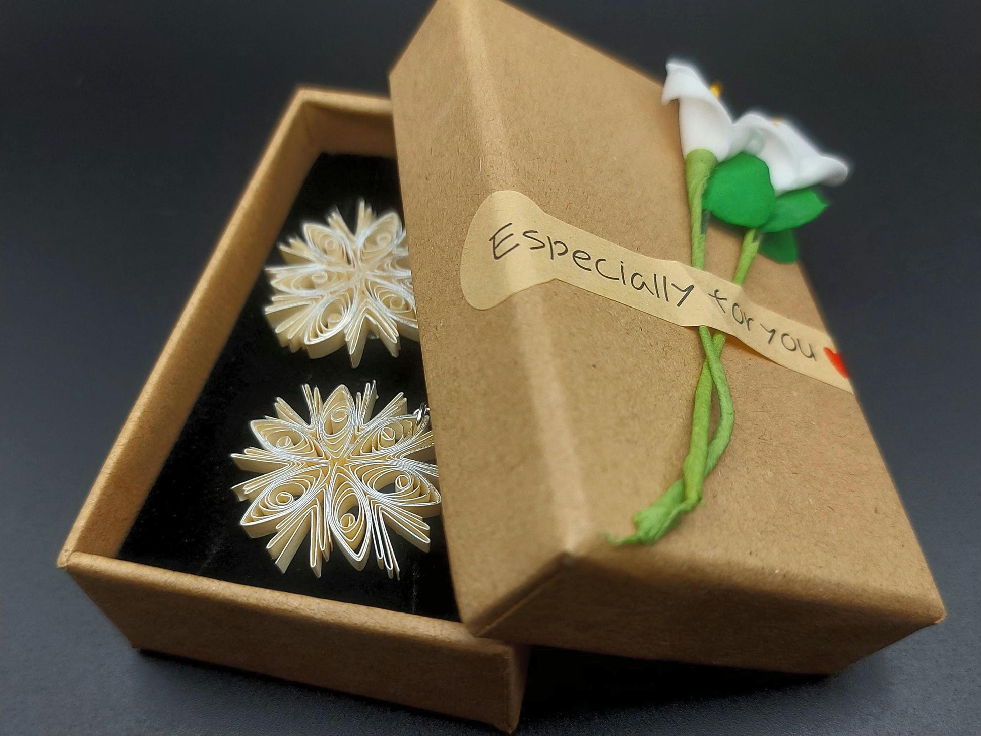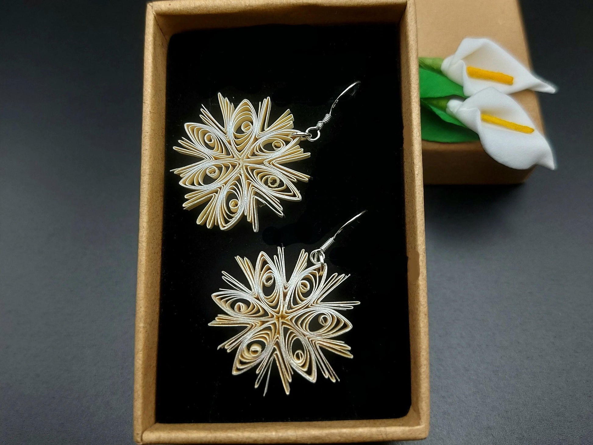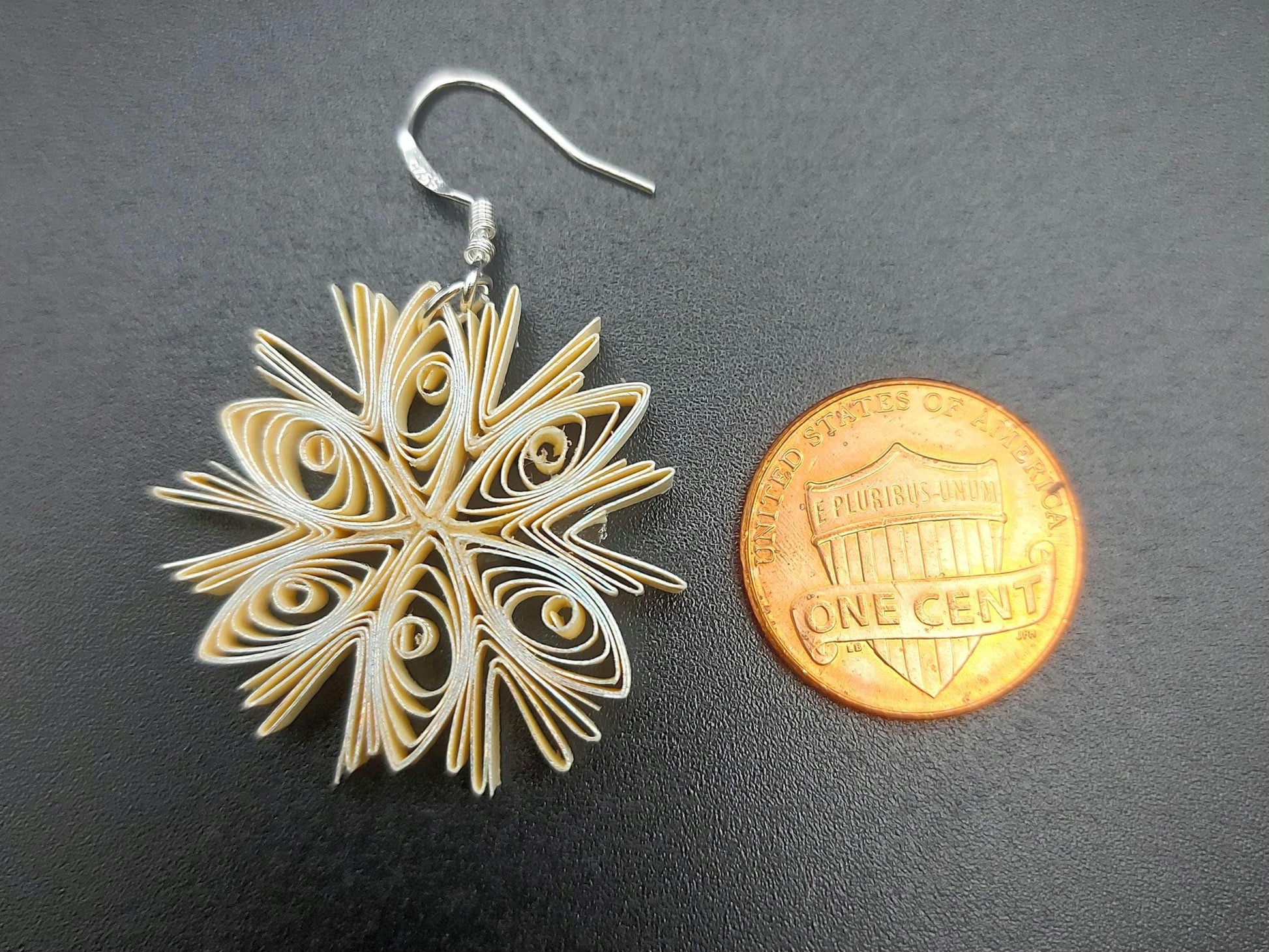 Are you looking for a special gift for someone or yourself? This is exactly what you are looking for. These beautiful hand crafted earrings are made from 1/8" thick quilling paper strip in silver edge ivory color. They are attached to hypo-allergenic silver plated earring hooks.