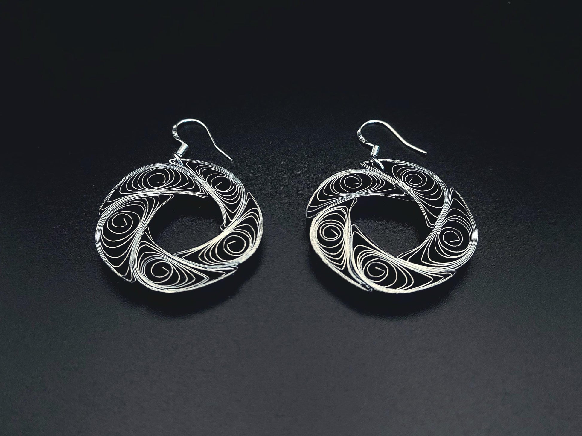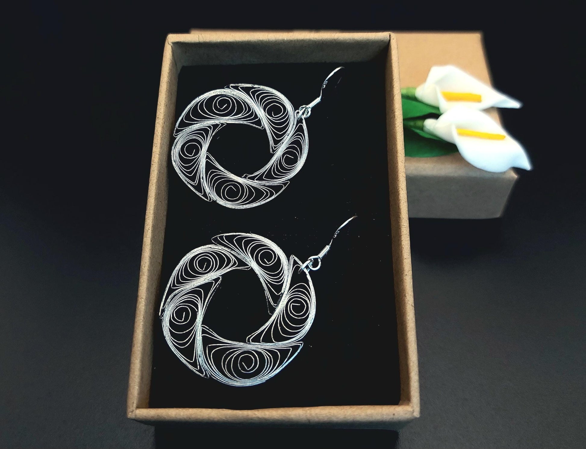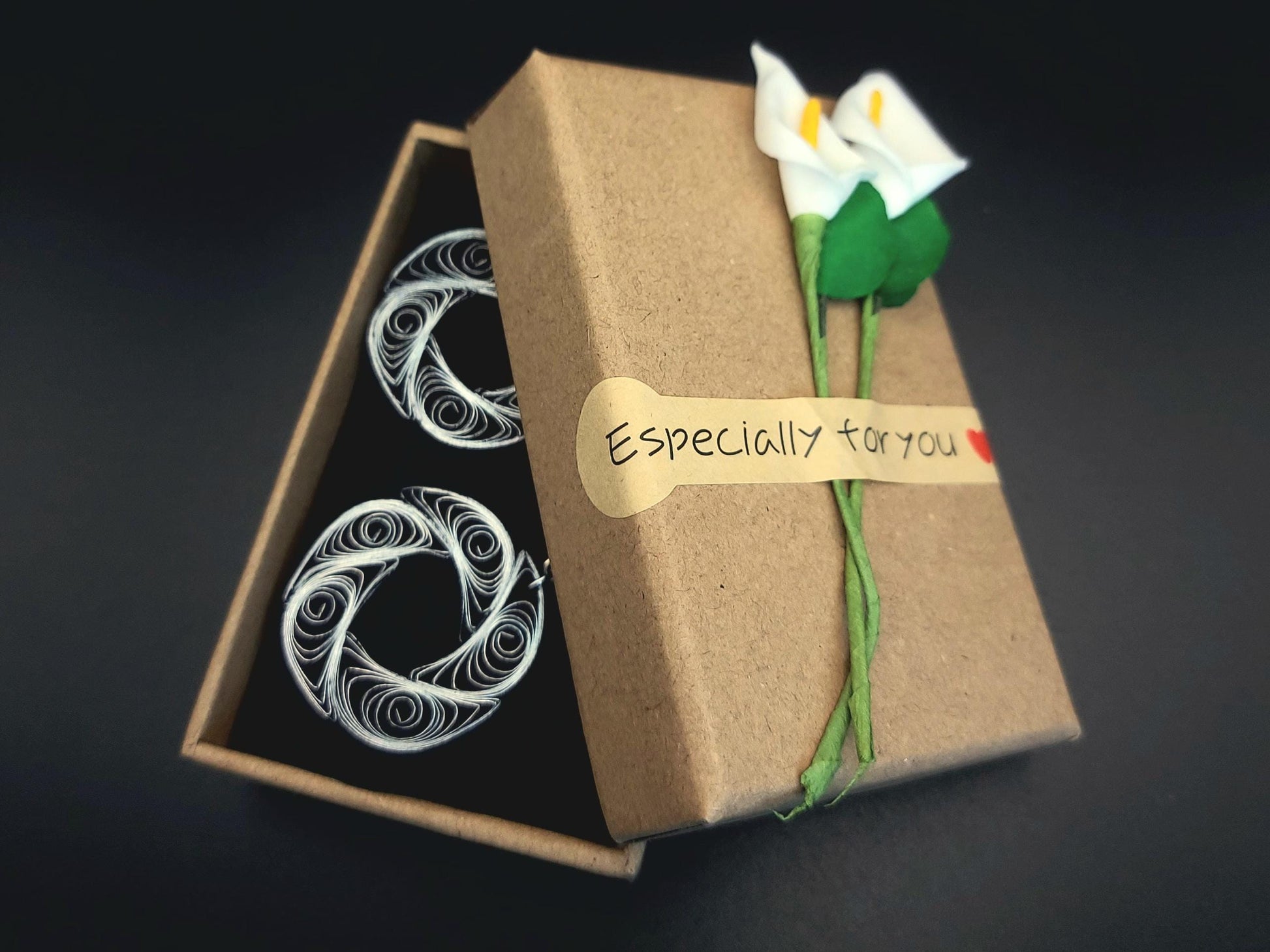 Are you looking for a special gift for someone or yourself? This is exactly what you are looking for. These beatiful hand crafted earrings are made from 1/8" thick quilling paper strips in silver edge black color. The sides and backside of the earrings are black. They are attached to Hypoallergenic Silver Plated Earring Hooks.