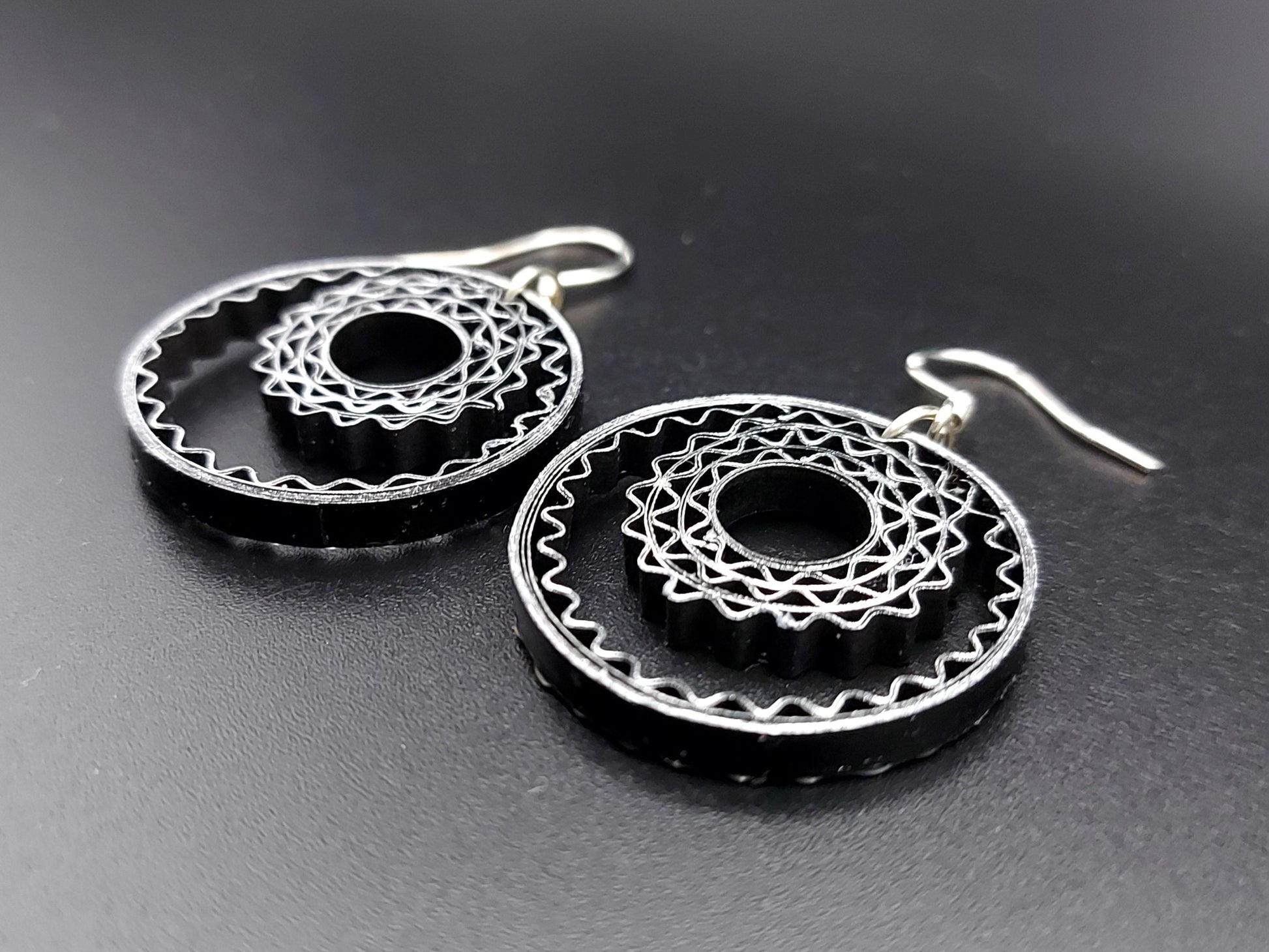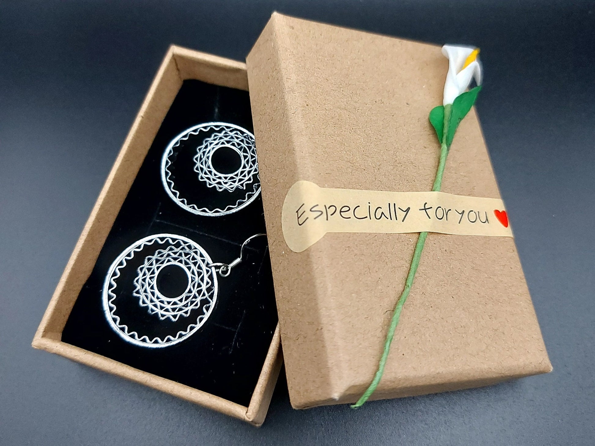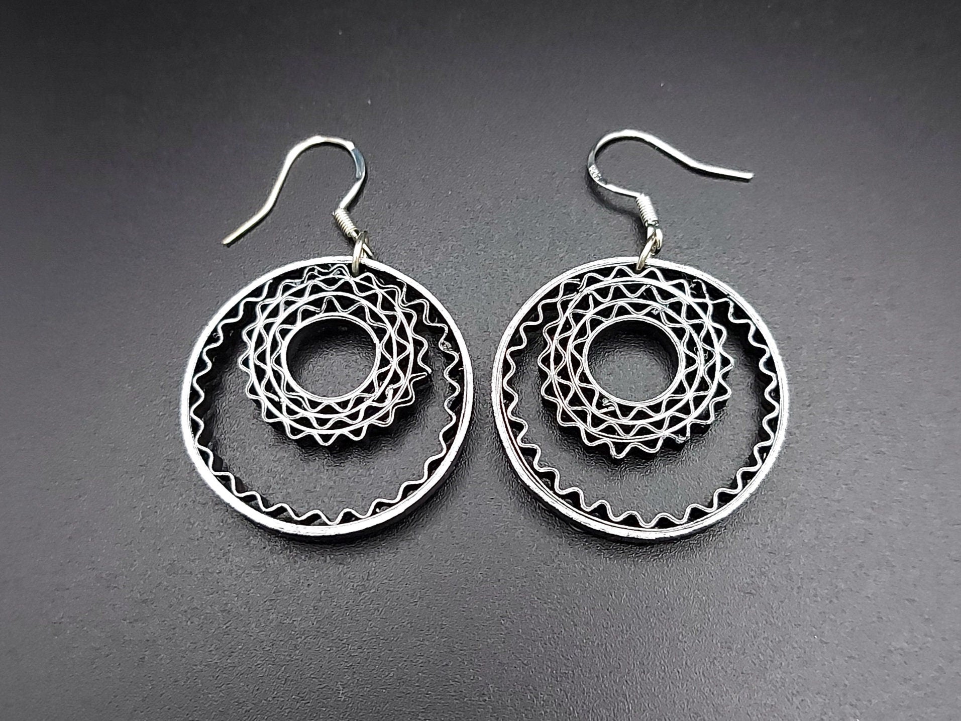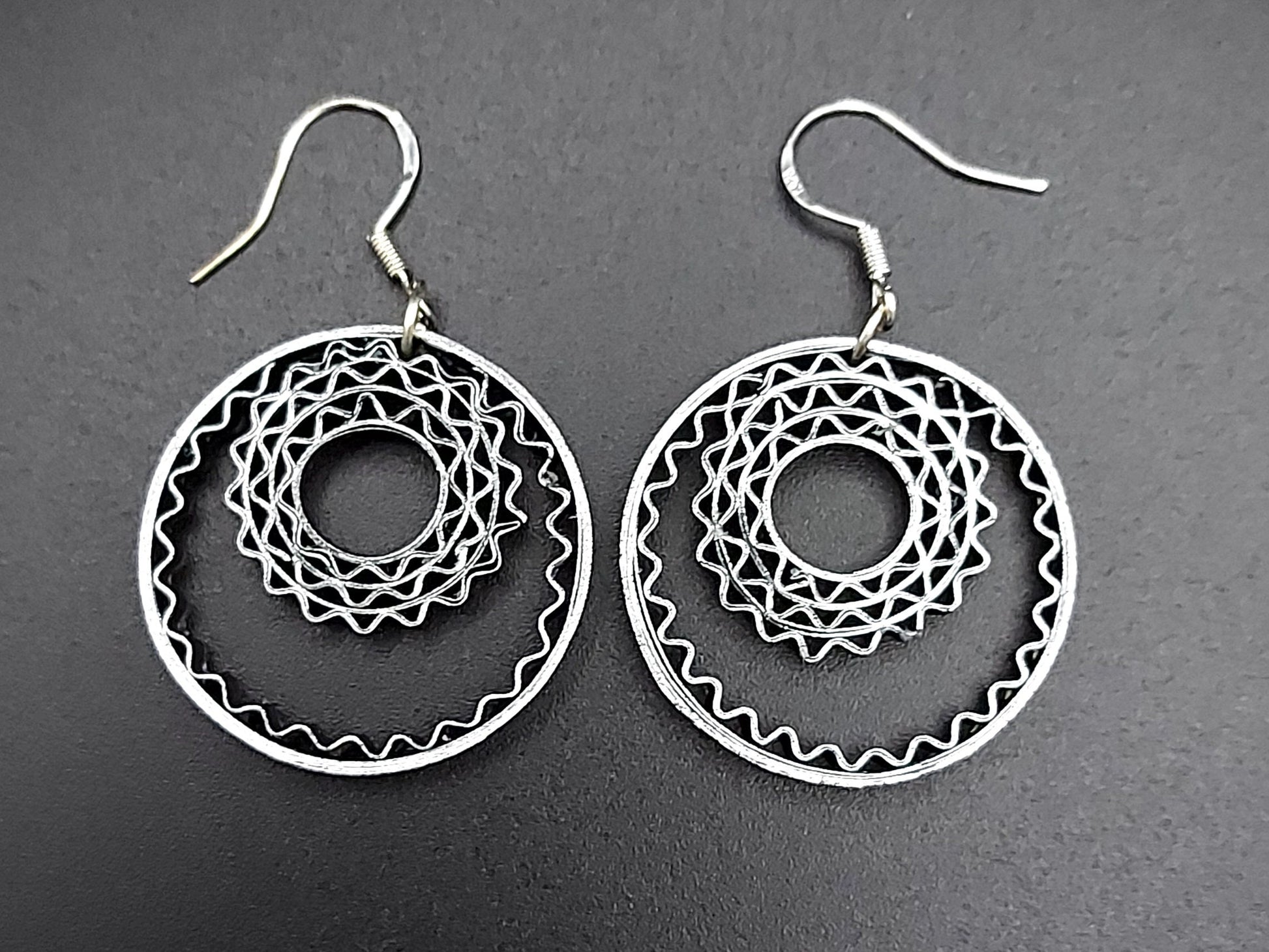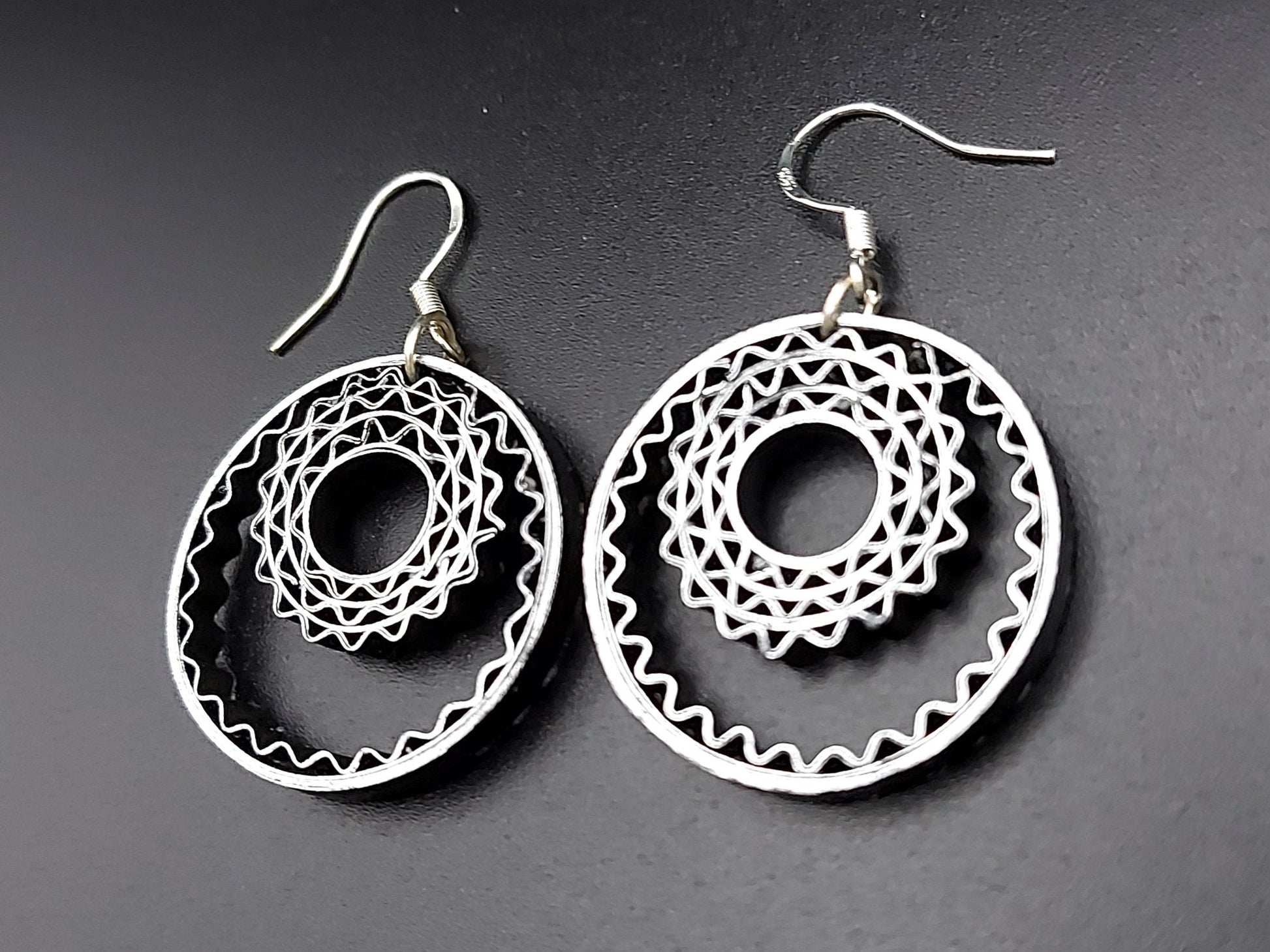 These hand crafted earrings are made from 1/8" thick quilling paper strips. They are attached to hypoallergenic silver plated earring hooks.