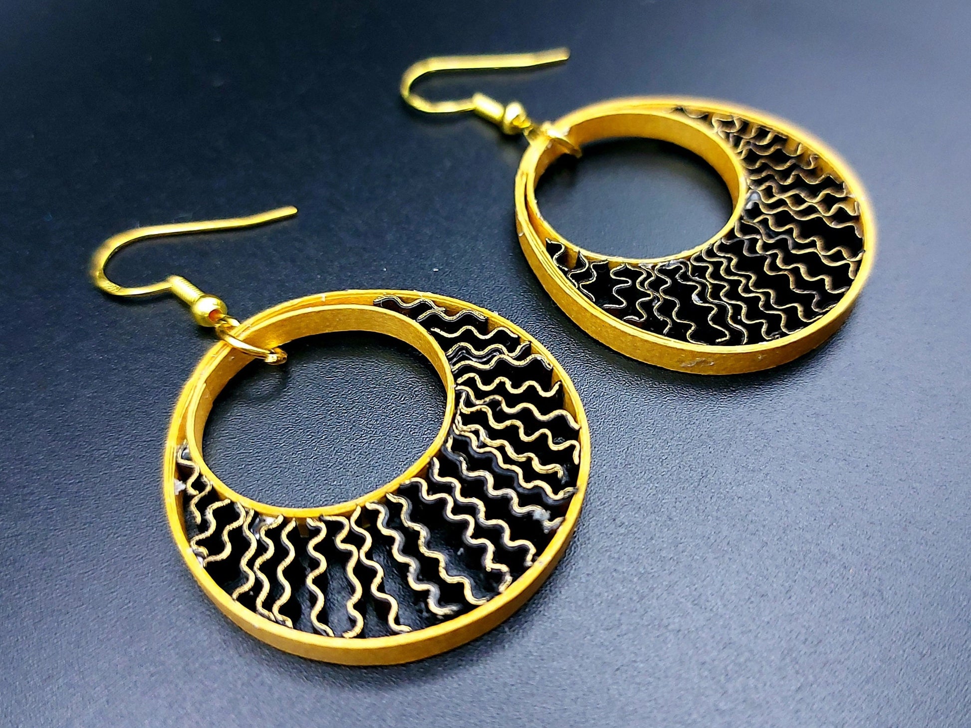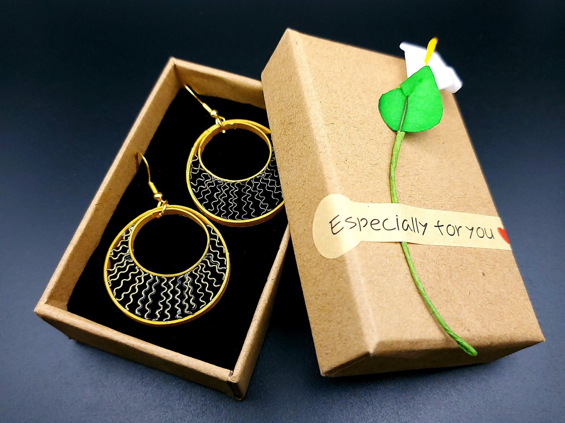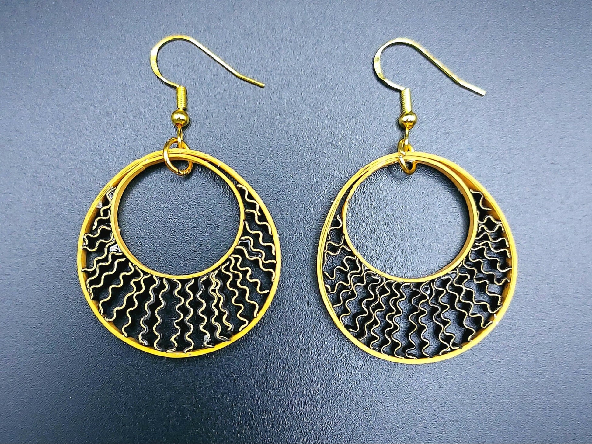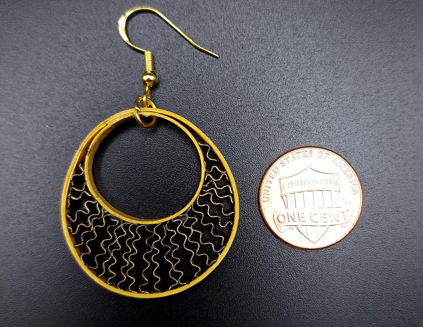 Are you looking for a special gift for someone or yourself? This is exactly what you are looking for. These beautiful hand crafted earrings are made from 1/8" thick quilling paper strips. Two variations are available: gold and gold edged black colors or gold and purple colors. They are attached to hypo-allergenic silver plated earring hooks.