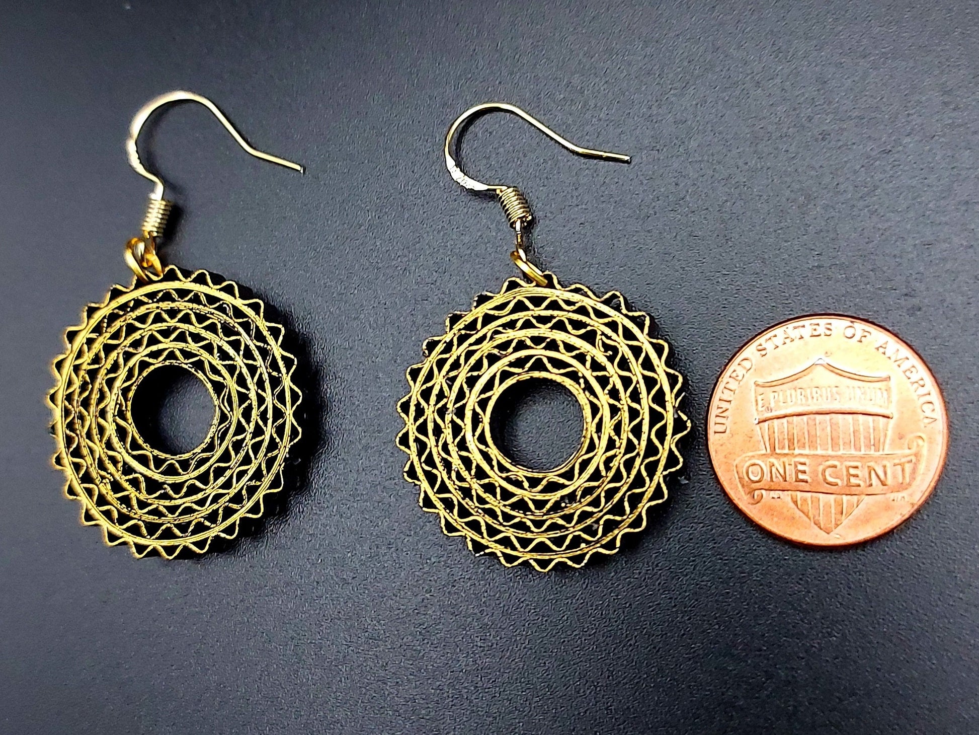 These beatiful hand crafted earrings are made from 1/8" thick quilling paper strips in silver edge black color. The sides and backside of the earrings are black. They are attached to Hypoallergenic Silver Plated Earring Hooks.